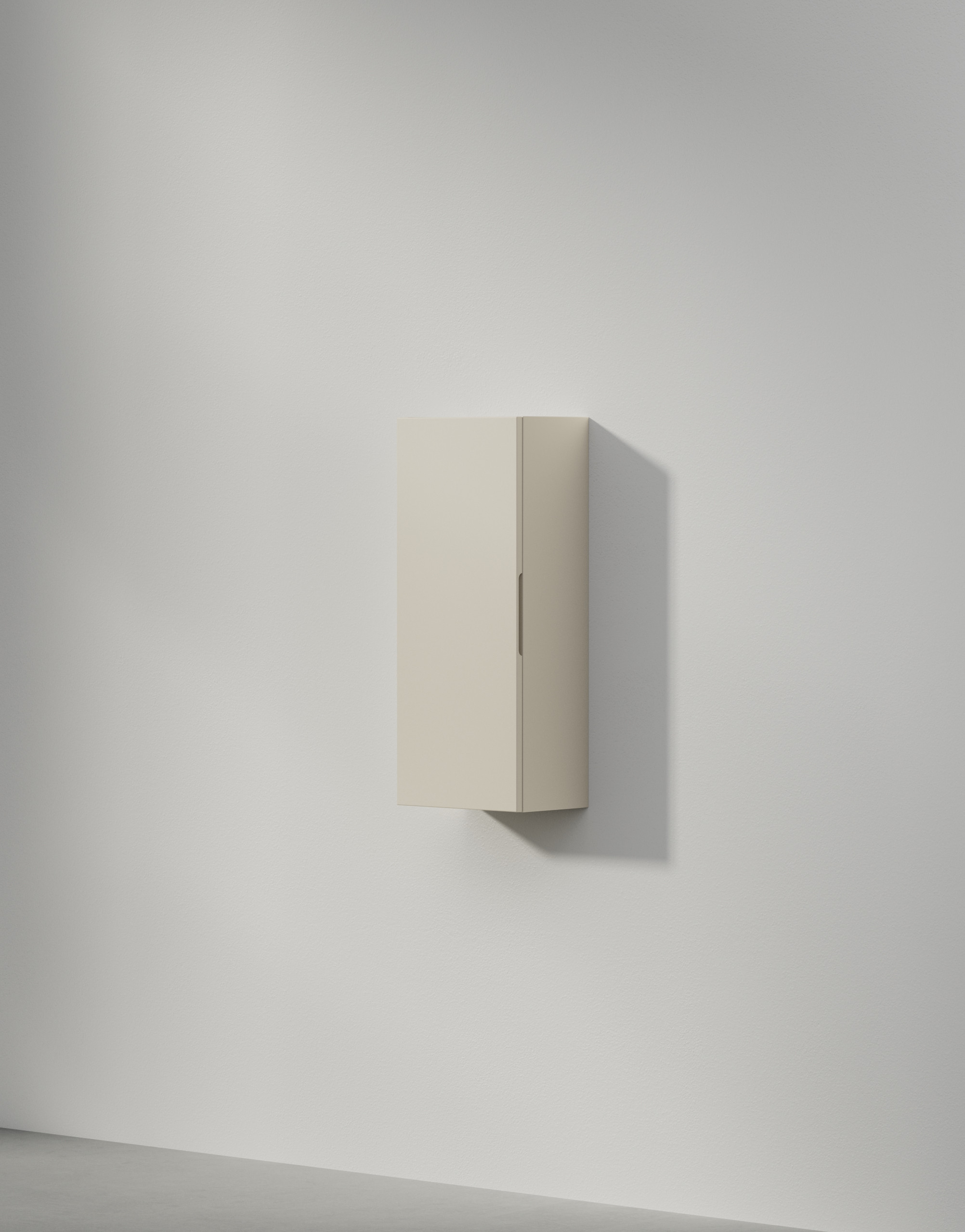 Väggskåp som matchar kommoderna i möbelserie Viskan Solid. Skåpet kommer med infräst grepp i dörren som du vid beställning väljer om du vill ha monterad till höger eller vänster. Komplettera med grepp eller handtag om du vill. Skåpet har två hyllplan i 6 mm härdat säkerhetsglas, samtliga flyttbara. Två väggskåp kan placeras intill varandra om du beställer ett med öppning åt vänster, det andra åt höger.