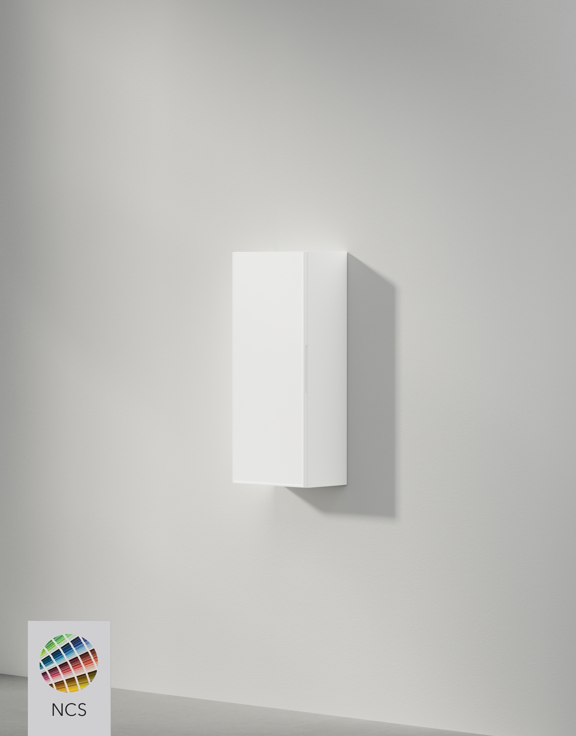 Väggskåp som matchar kommoderna i möbelserie Viskan Shade. Skåpet kommer med infräst grepp i dörren som du vid beställning väljer om du vill ha monterad till höger eller vänster. Komplettera med grepp eller handtag om du vill. Skåpet har två hyllplan i 6 mm härdat säkerhetsglas, samtliga flyttbara. Två väggskåp kan placeras intill varandra om du beställer ett med öppning åt vänster, det andra åt höger.