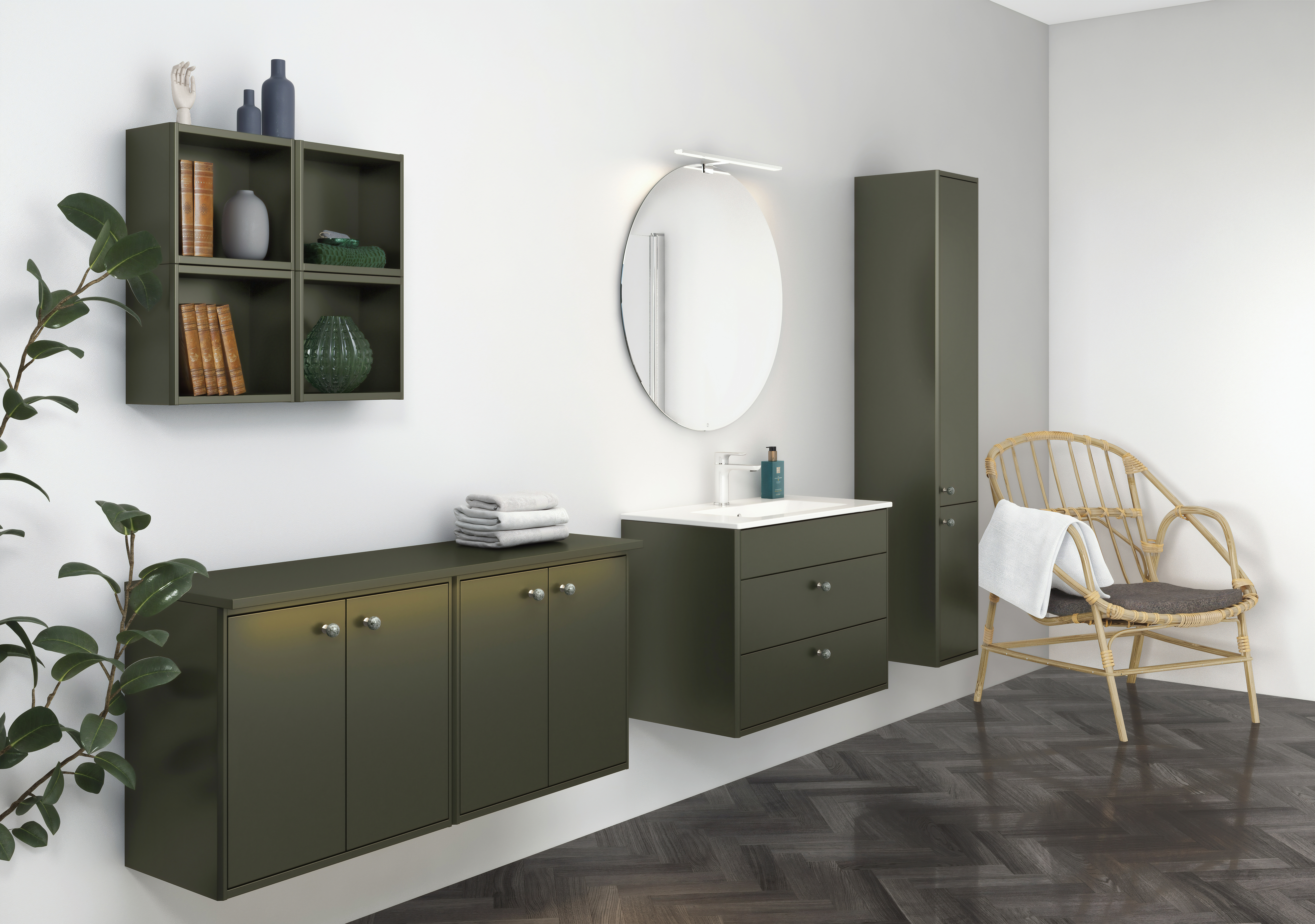 Graphic Väggskåp grön 60x32 cm. Upphängningssystem som lätt och snabbt monteras på vägg och enkelt justeras till rätt position. Kan komplettera med Graphic toppskiva med integrerad belysning.