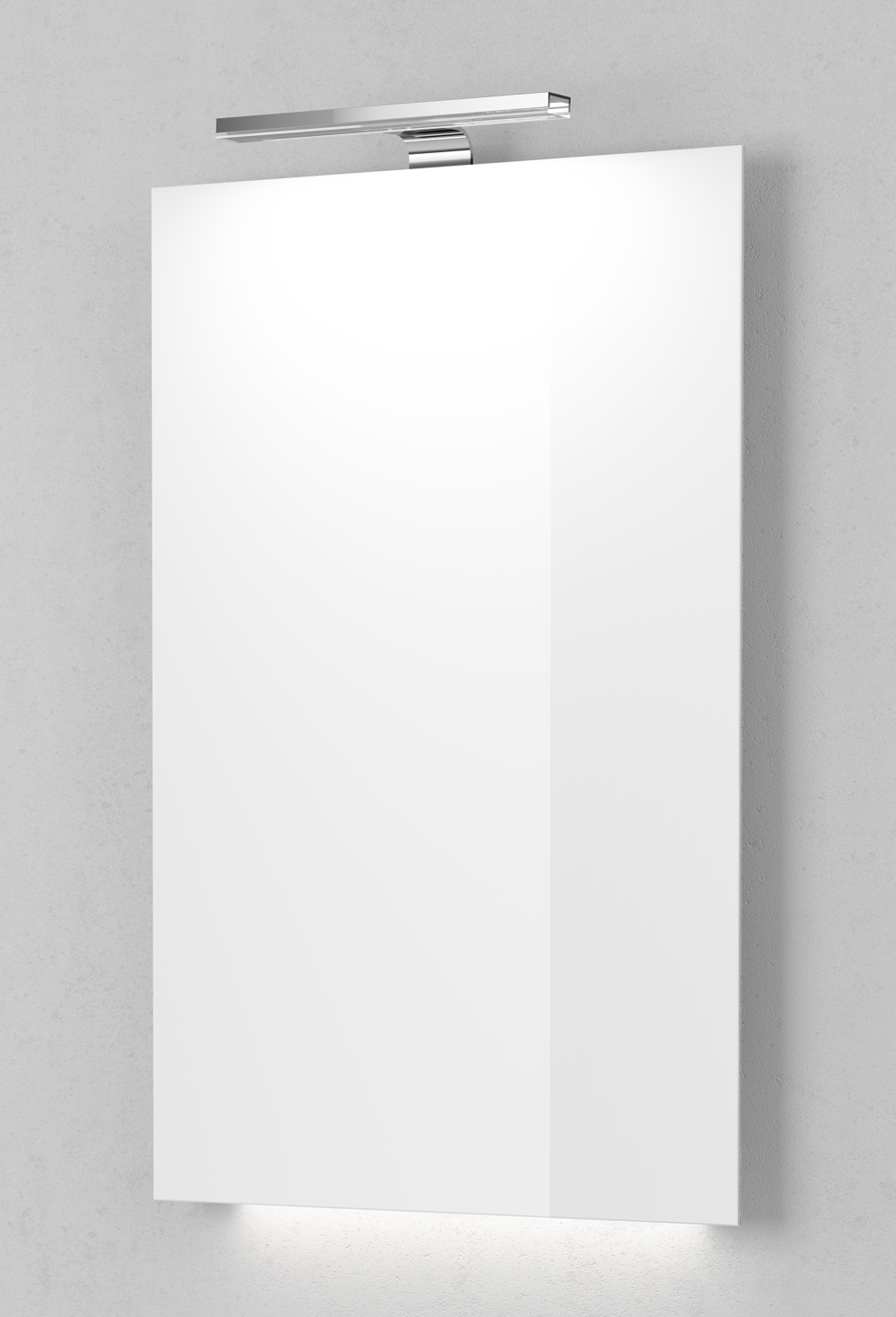 Spegel FEEL i 50 cm bredd är en klassisk badrumsspegel där belysningsarmatur och underbelysning i LED ingår. Spegeln har ingen av/på-knapp utan kopplas till rummets strömbrytare.