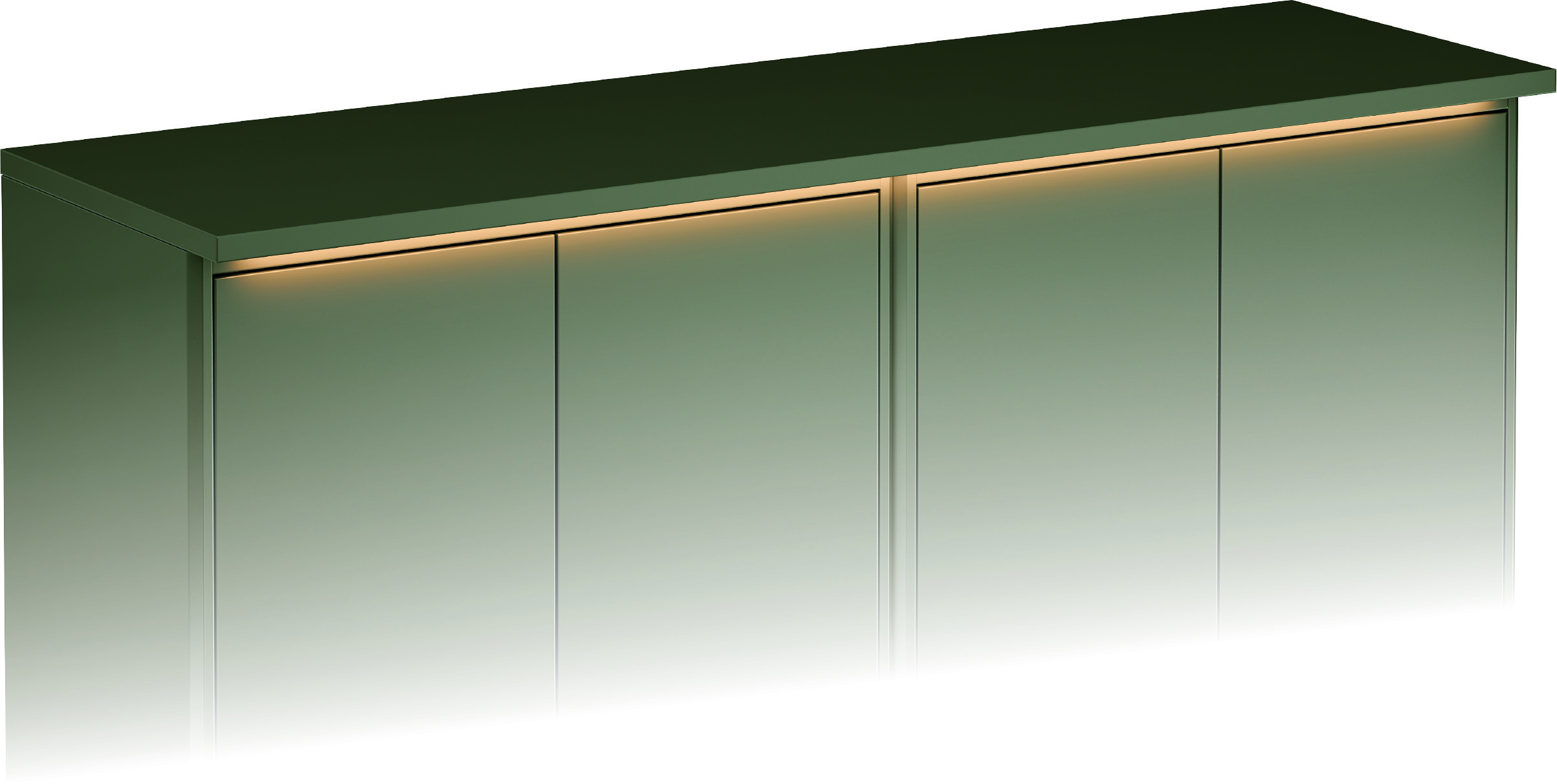 Graphic Toppskiva med belysning grön 120x36 cm. Monteras på 2 st Graphic väggskåp med djup 32 cm. Integrerad LED-belysning som lyser upp in i skåpet när luckorna är öppna och ger dekorativ belysning av luckorna när de är stängda.