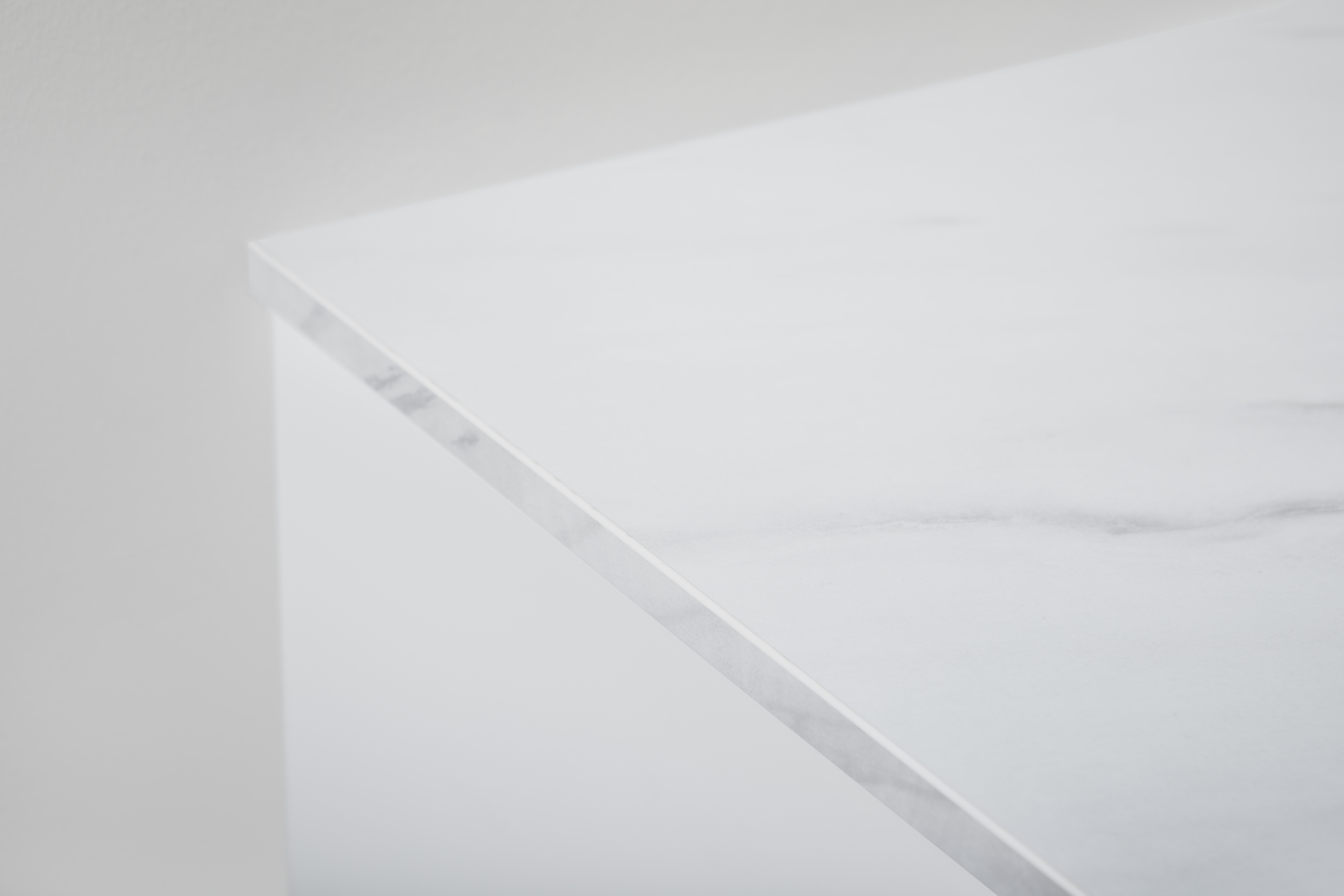 Marmormönstrad bänksiva av melaminbelagd MDF. Håltagning utförs av installatör beroende på blandare och fristående handfat samt val av placering.
