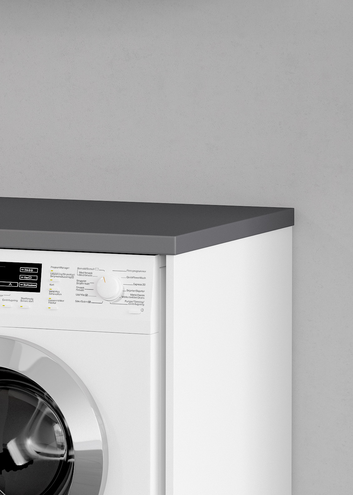 Kantlistad bänkskiva som måttanpassas i längden 200–740 mm till klädvård i badrum, tvättstuga eller grovkök. Bänkskivan är tillverkad av det mycket slitstarka och formstabila laminatet HPL som har en sammetslen yta med antibakteriella egenskaper och dom är motståndskraftig mot fingeravtryck och andra märken.
