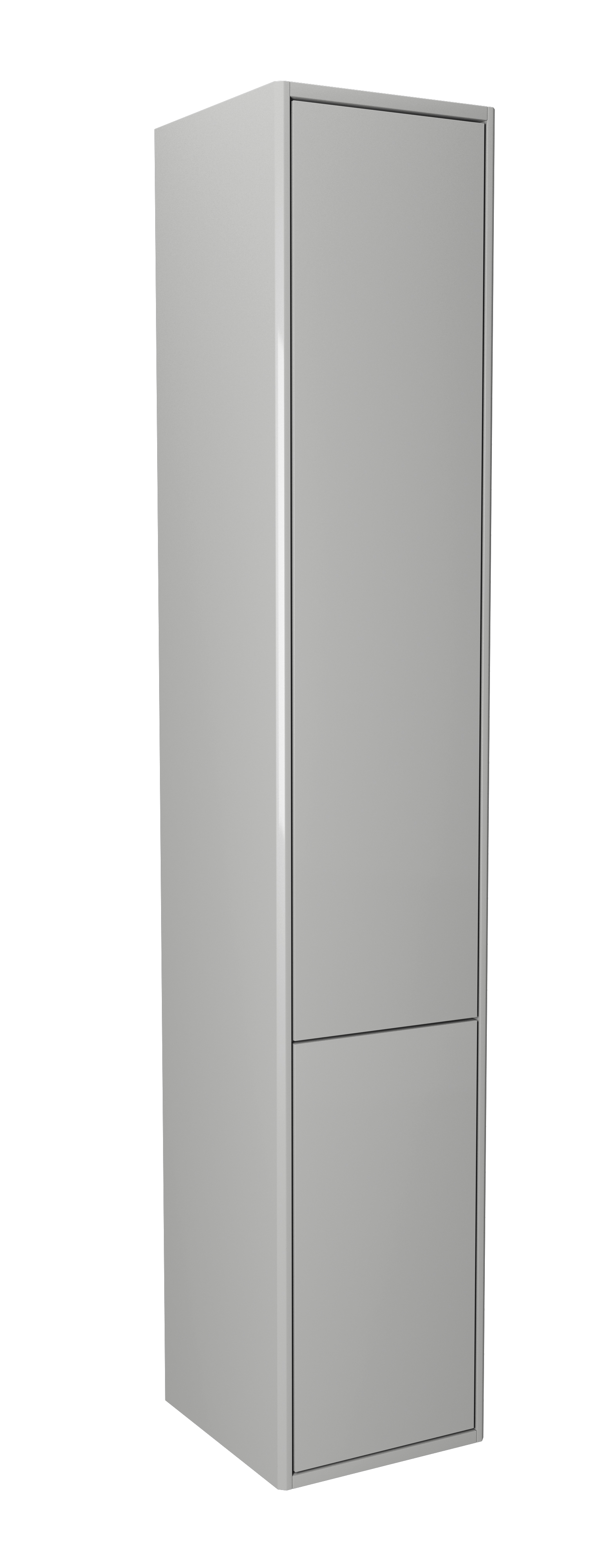 Gustavsberg Graphic Högskåp med två grå släta luckor. 30x32 cm. Mjukstängande dörrar som är vändbara för höger- eller vänstermontage. Smart förvaring i den övre dörren i form av praktiska förvaringsfack. 1 fast hyllplan i trå och 4 flyttbara hyllplan i glas. Finns en grundare modell med 16 cm djup.