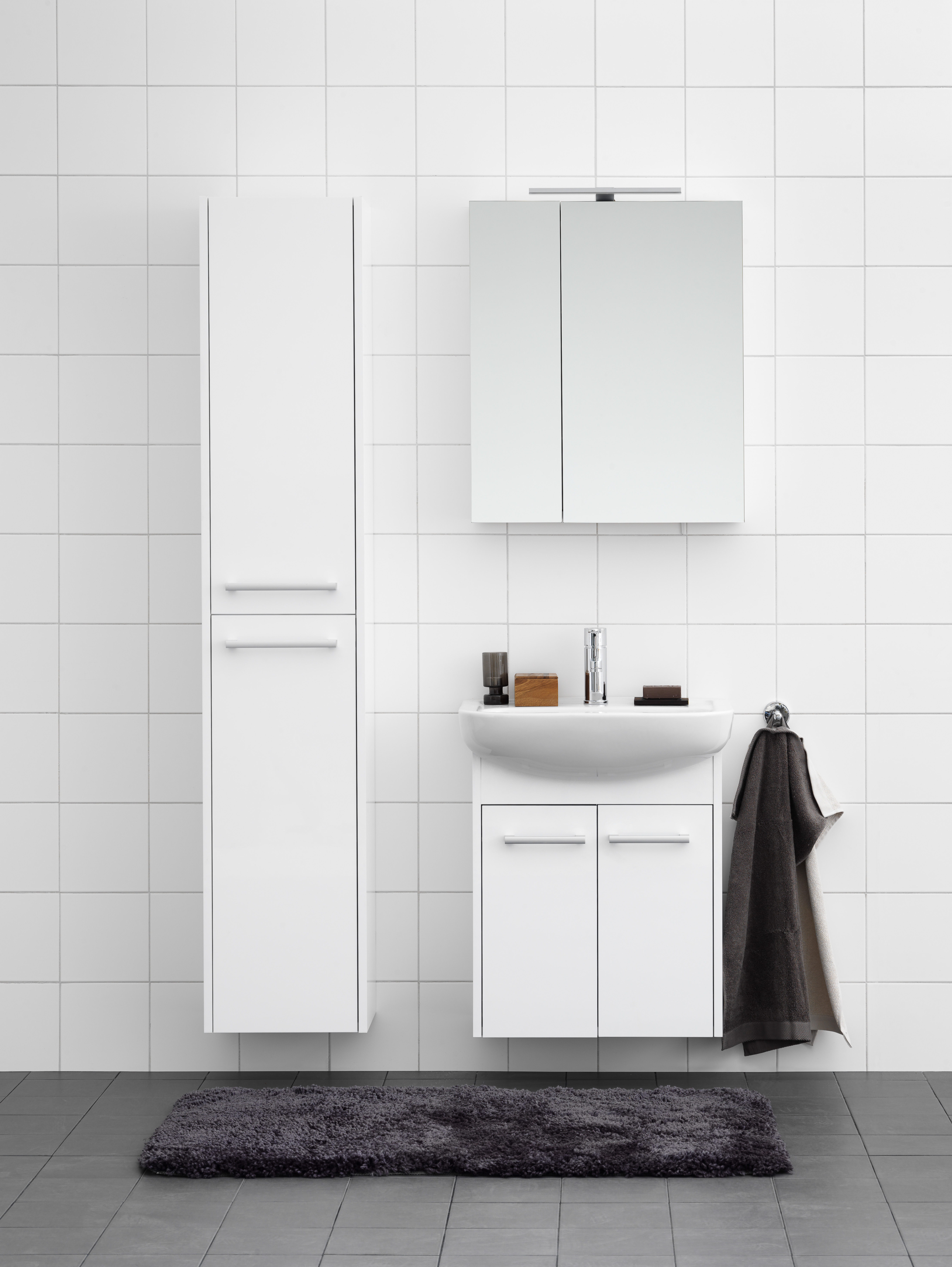 GBG Nordic³ Högskåp, Glossy White. Två flyttbara glashyllplan och ett fast hyllplan. Handtag i aluminium ingår. 2 dörrar med Soft Close för mjuk stängning.
