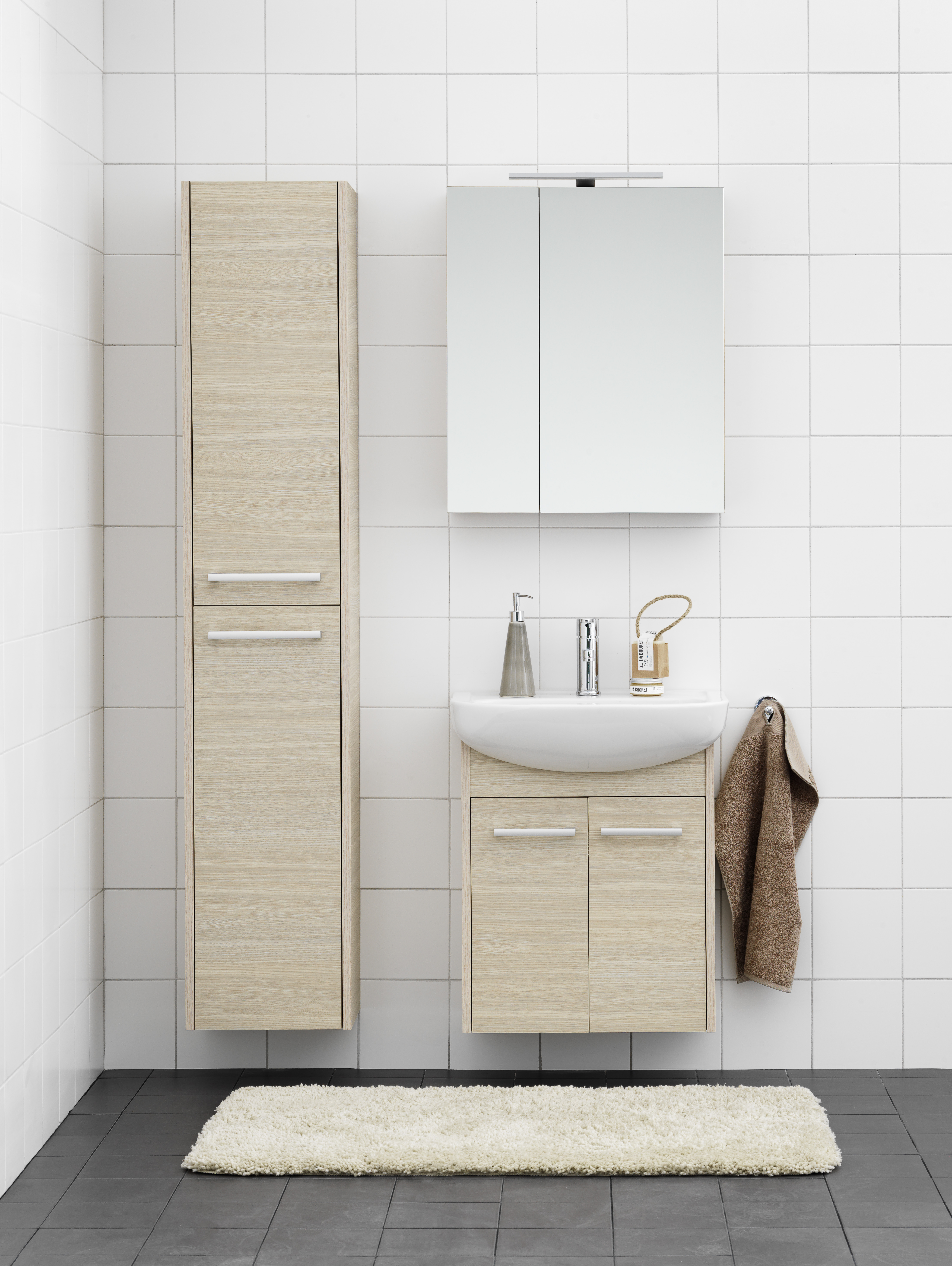 GBG Nordic³ Högskåp, Light Wood effekt. Två flyttbara glashyllplan och ett fast hyllplan. Handtag i aluminium ingår. 2 dörrar med Soft Close för mjuk stängning. Skåp och luckor i högglans vit lack. Levereras monterat.