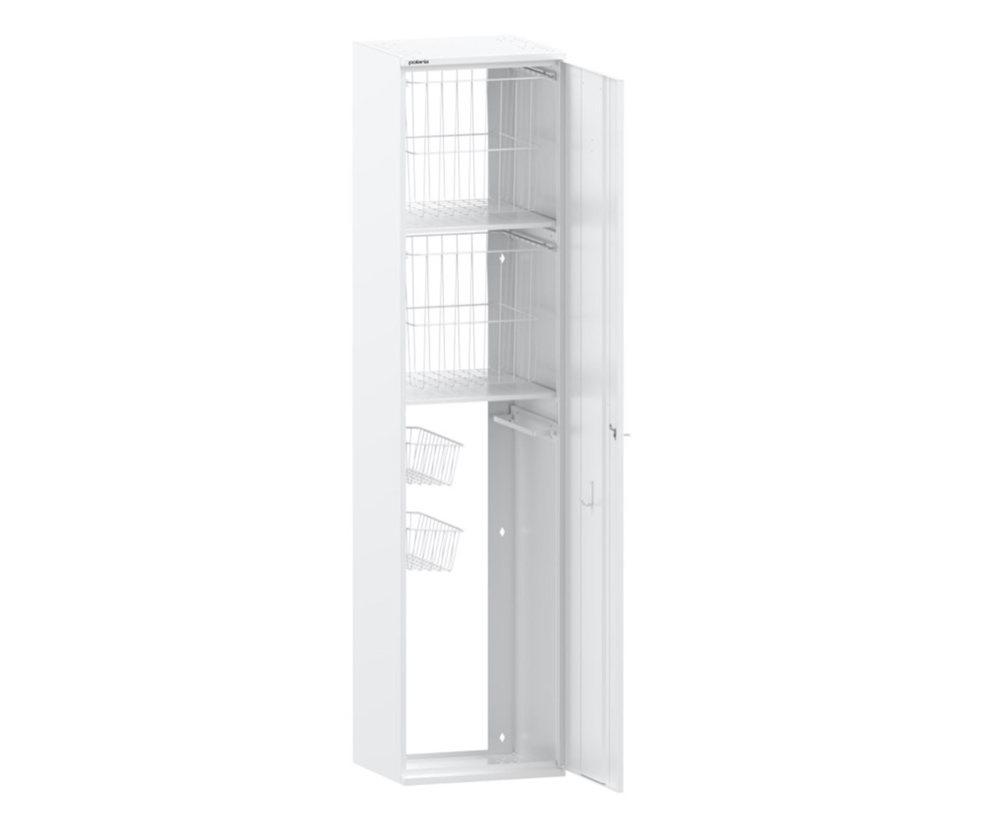 I modellen Combi har tvättskåpets och städskåpets bästa egenskaper kombinerats till en fungerande helhet. Produkt är tillgänglig med en korg eller två korgar. Skåpet är tillverkat i pulvermålat stål med nanokeramisk ytbehandling. 2 hyllor, 2 tvättkorgar och 2 redskapskorgar. Handduksstång och hängkrok. Cylinderlås. Bottnen på skåpet har färdiga hål för möbelben. Högerhänt.