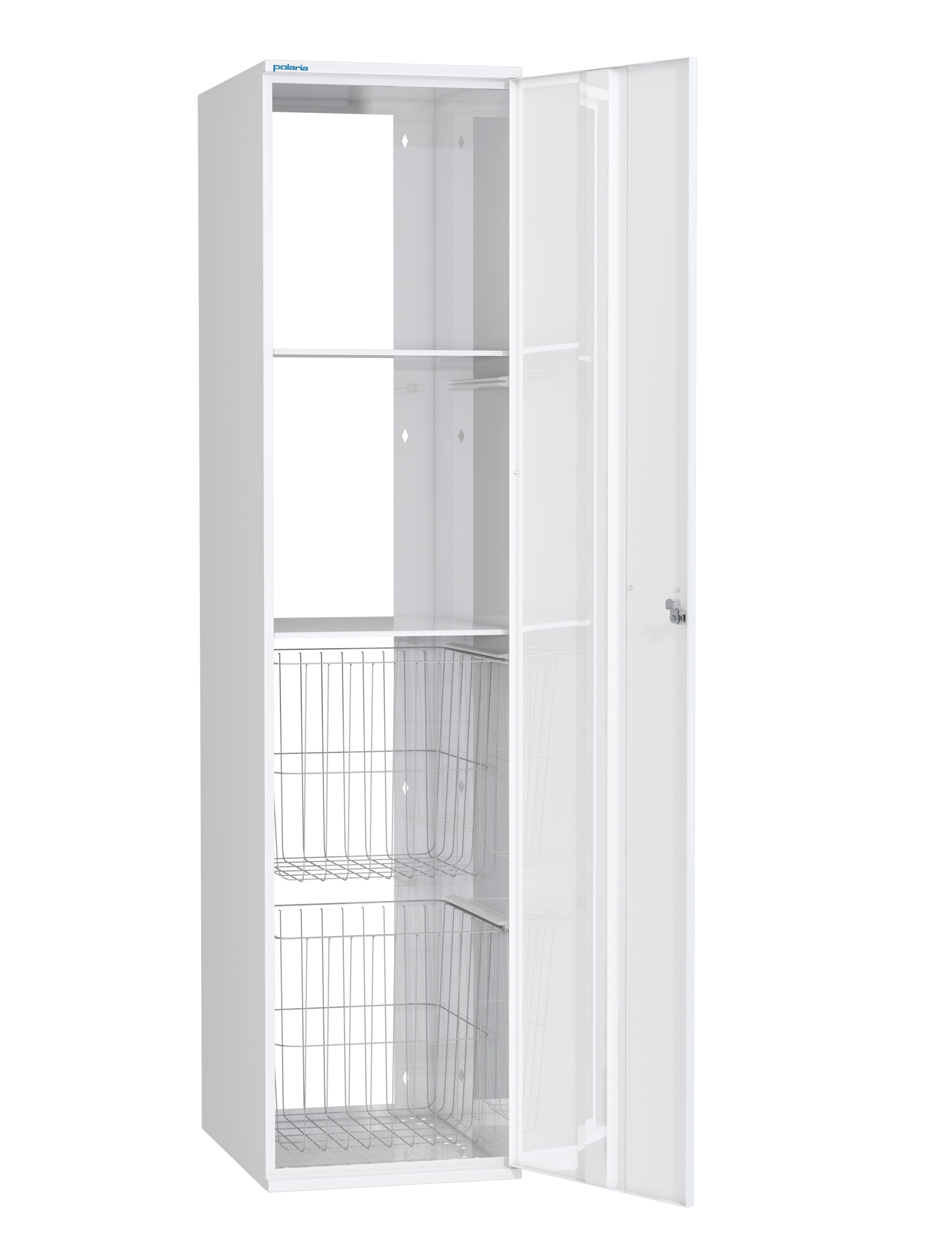 Skåpet är tillverkat i pulvermålat stål med nanokeramisk ytbehandling. Två korgar och två fasta hyllor. Cylinderlås. Bottnen på skåpet har färdiga hål för möbelben. Högerhänt.