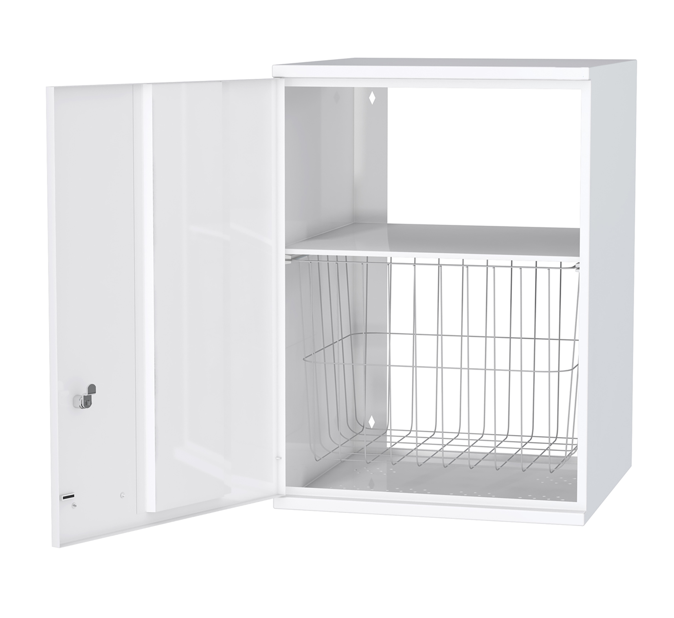 Skåpet är tillverkat i pulvermålat stål med nanokeramisk ytbehandling. En korg och en fast hylla. Cylinderlås. Vänsterhänt.