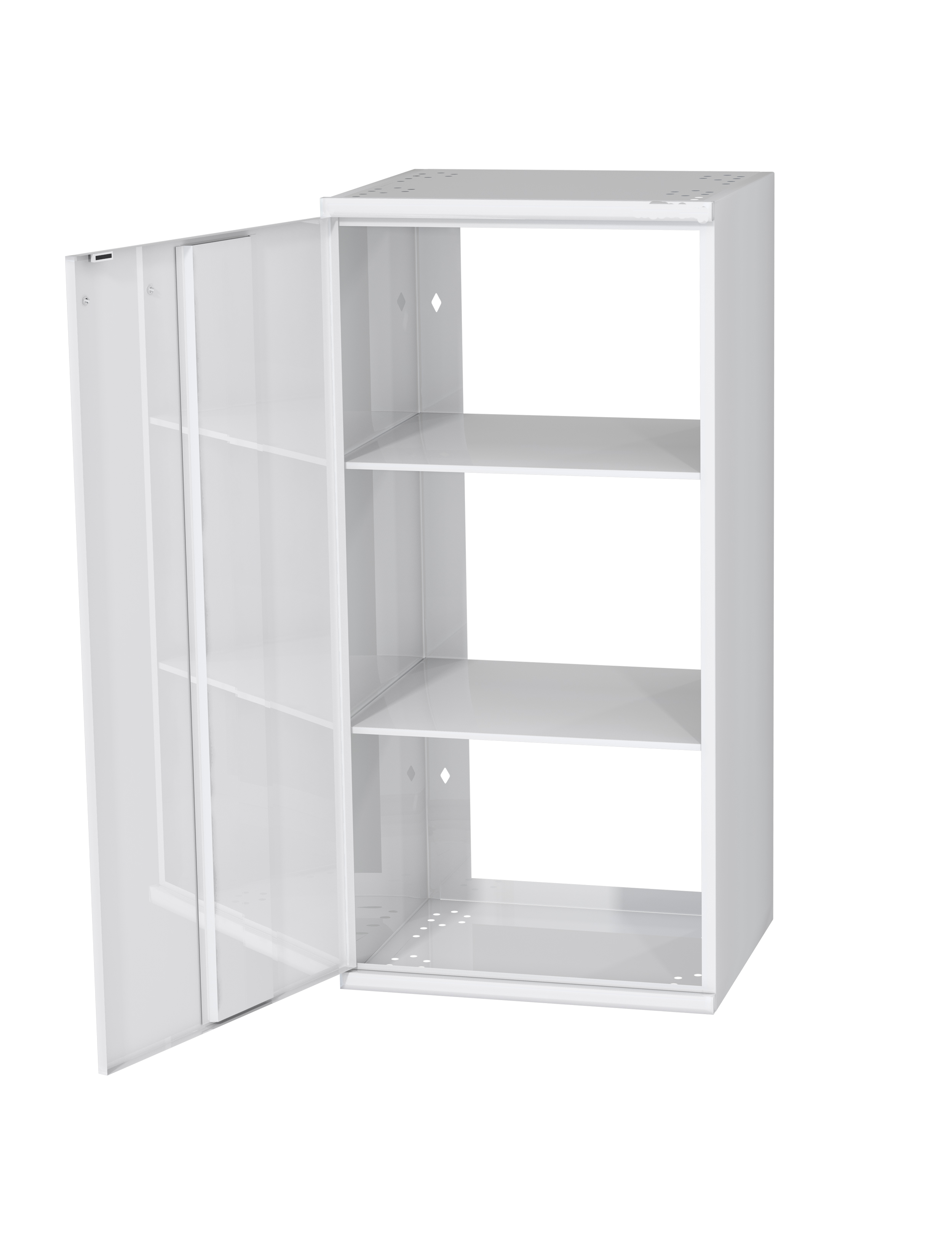 Skåpet är tillverkat i pulvermålat stål med nanokeramisk ytbehandling. Två hyllor. Bottnen på skåpet har färdiga hål för möbelben. Vänsterhänt.