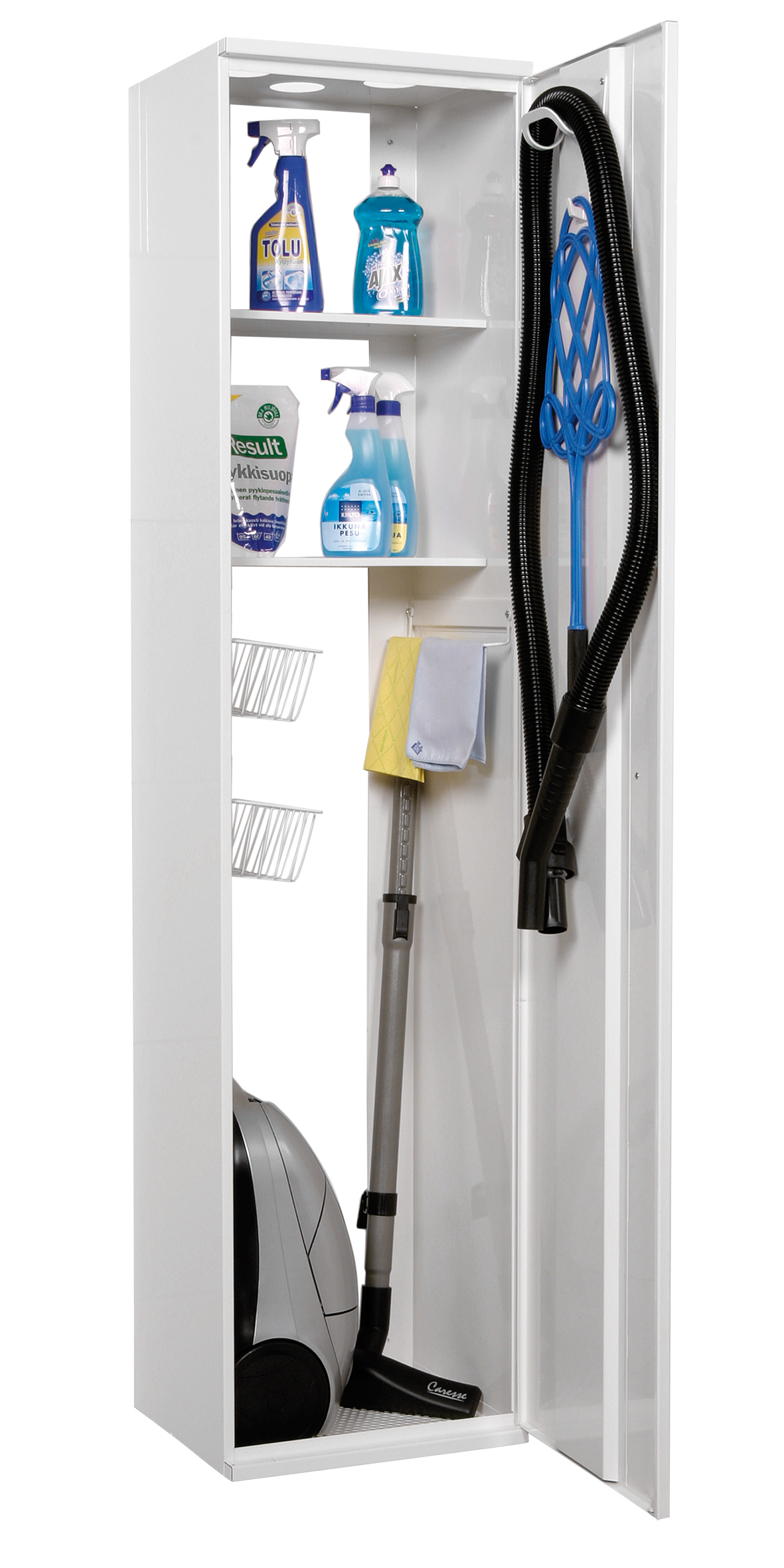 Skåpet är tillverkat i pulvermålat stål med nanokeramisk ytbehandling. Cylinderlås. Två hyllor och två redskapskorgar. Handduksstång, böjd krok för dammsugarslangen och hängkrok. Bottnen på skåpet har färdiga hål för möbelben. Högerhänt.