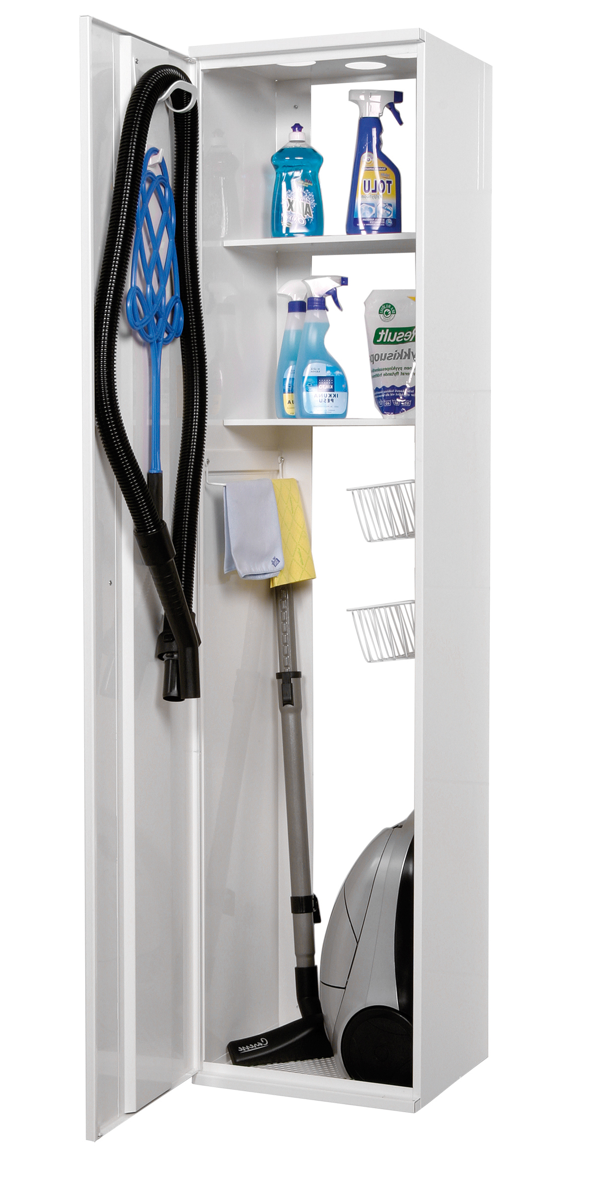 Skåpet är tillverkat i pulvermålat stål med nanokeramisk ytbehandling. Cylinderlås. Två hyllor och två redskapskorgar. Handduksstång, böjd krok för dammsugarslangen och hängkrok. Bottnen på skåpet har färdiga hål för möbelben. Vänsterhänt.