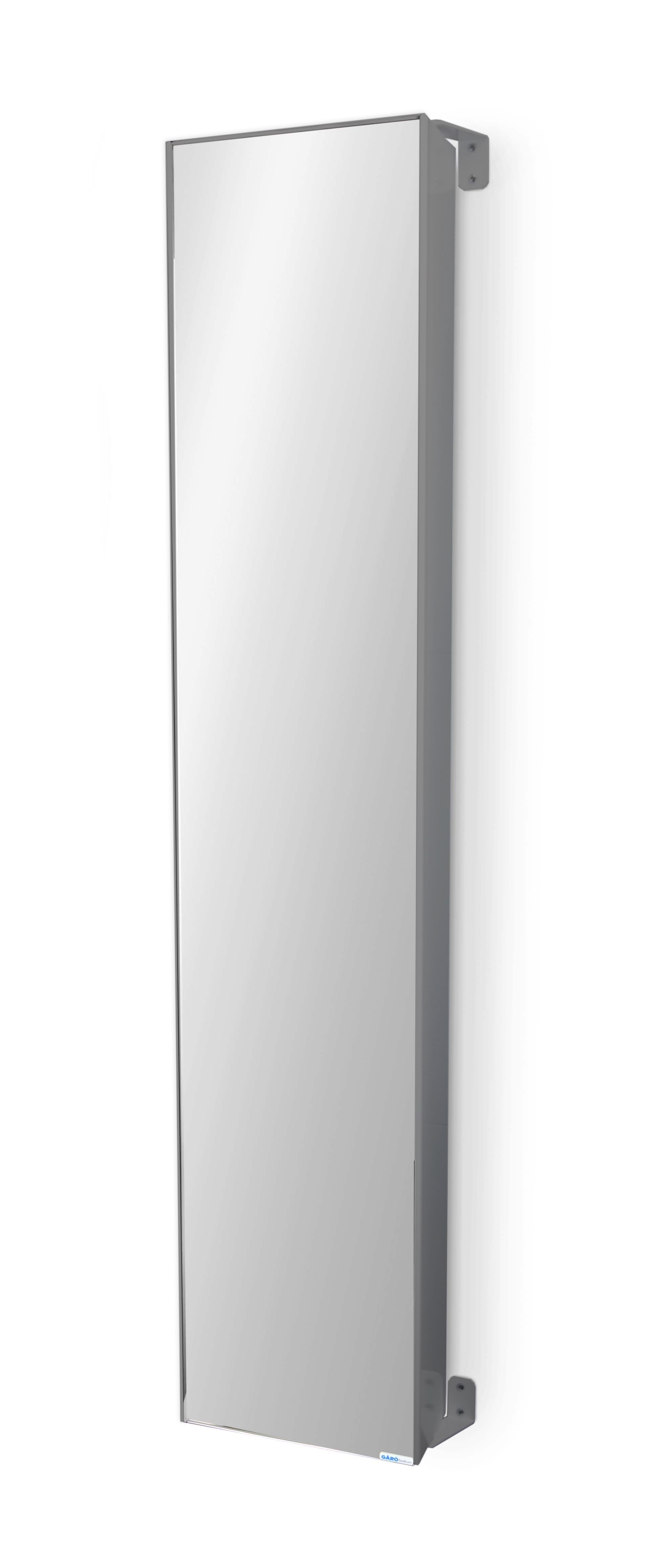 Öppet högskåp med 4st hyllor på en sida och en hel spegel på andra sidan.