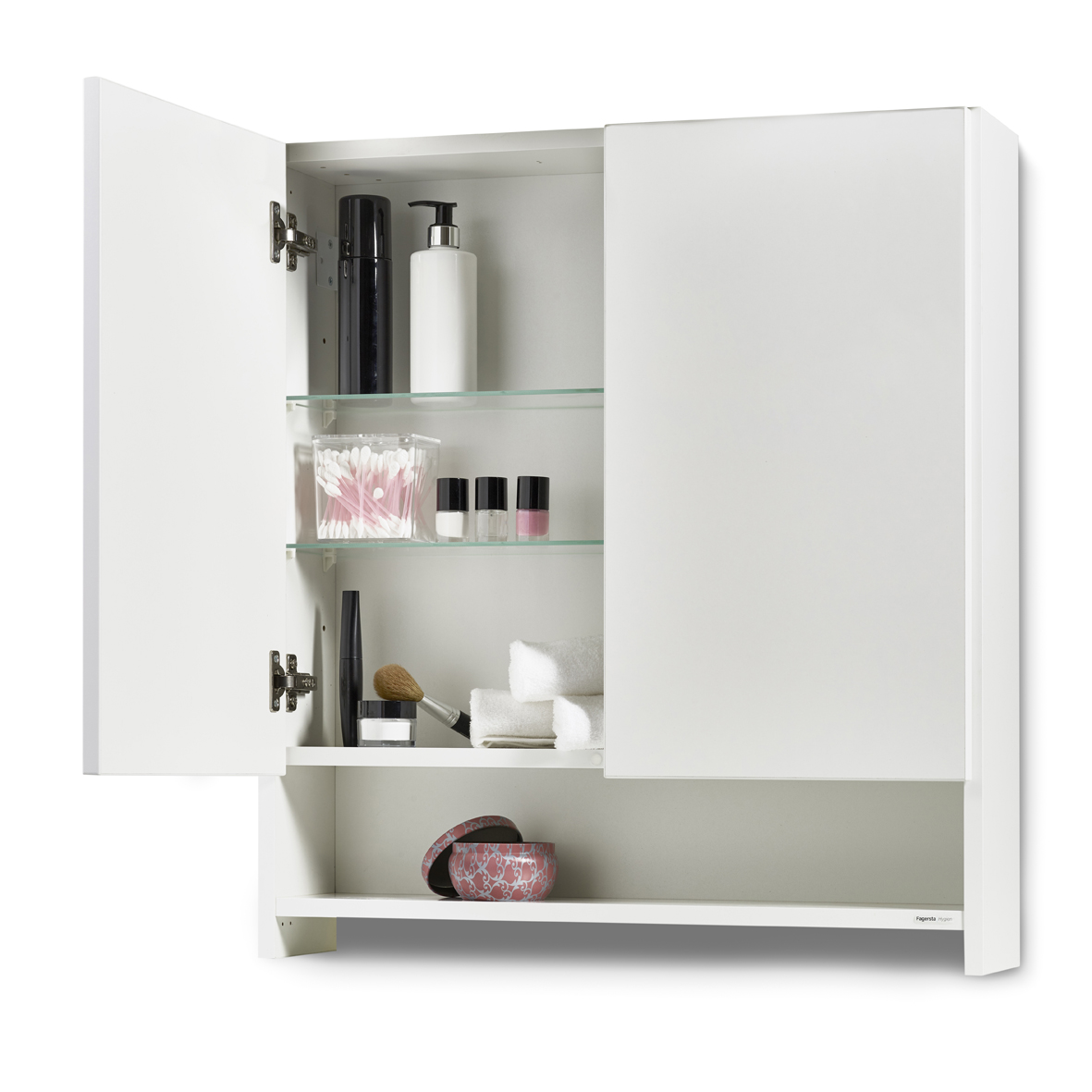 Ett rymligt badrumsskåp i trä med väl tilltagen höjd. Perfekt som komplement till spegel eller spegelskåp. Levereras färdigmonterat komplett med dörrar i folierad spånskiva med förstärkt kantlist. Två flyttbara glashyllor och en fast trähylla.