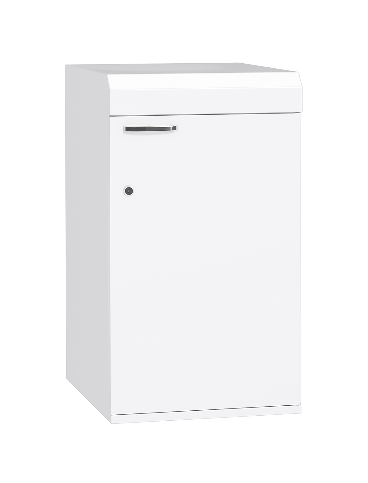 Skåpet är tillverkat i pulvermålat stål med nanokeramisk ytbehandling. En fast hylla och en tvättskorg. Cylinderlås och magnet. Bottnen på skåpet har färdiga hål för möbelben. Högerhänt.
