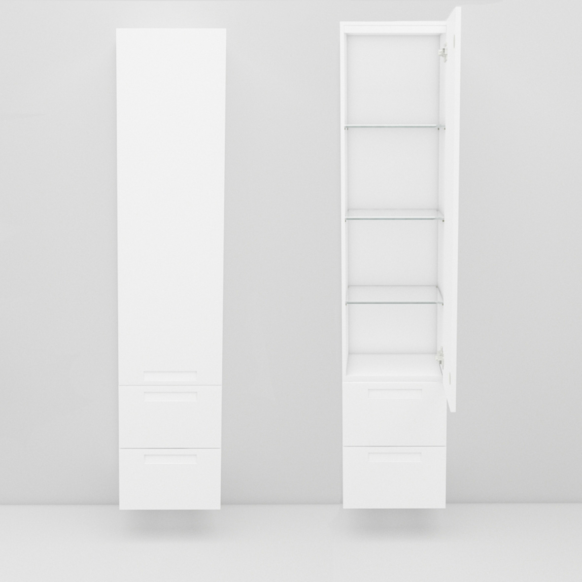 Komplettera ditt badrum med NORO Relounge högskåp för goda förvaringsmöjligheter. Högskåpet finns i vit högglans och matt svart fanér.