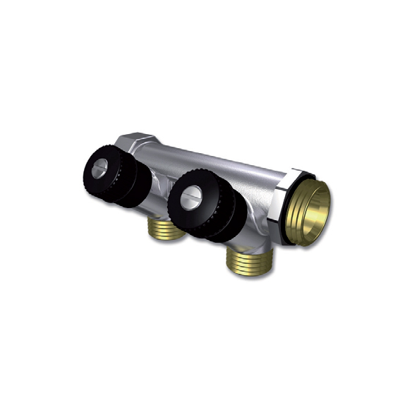 I förnicklad avzinkningsbest. mässing, påbyggnadsbar för värme och tappvattensystem. R20 ut- och inv. gg i ändarna samt avstick 50 mm c/c med utv.gg. Rör ansluts på avstick med anslutnings-koppling alt. pressanslutningskoppling. 20- rör som ansluts på avstick R15 dock endast med pressanslutningskoppling.