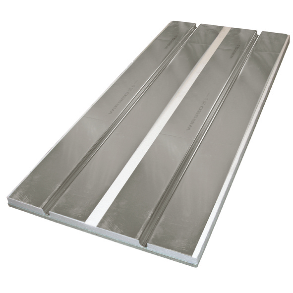 Självbärande med isolering och värmefördelningsplåtar med spår för 20 mm rör. För träbjälklag med c/c 600mm. Mått 1155x545x35 mm.