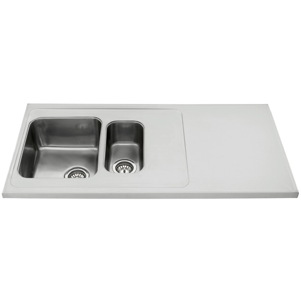 Vändbar diskbänk med slät yta och upphöjd kantprofil. Djup = 610 mm, tjocklek = 30 mm, hodjup=180 mm.