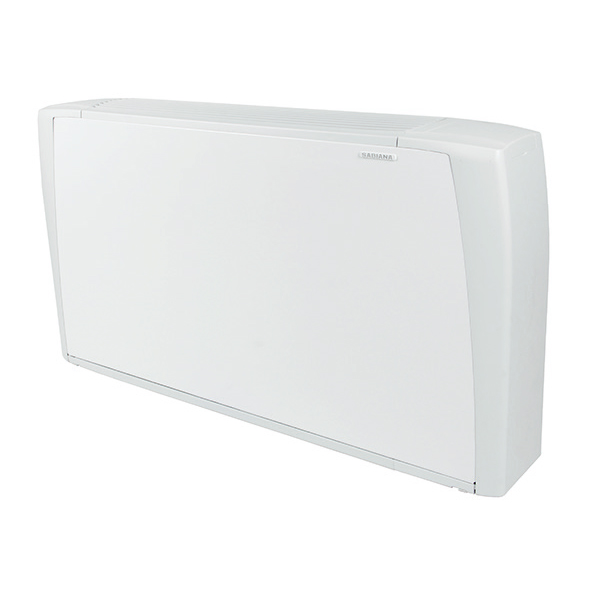 Elegant och extremt tystgående fläktkonvektor för uppvärmning eller kyla (kompletteras med extra batteri om värme och kyla ska kopplas in samtidigt)