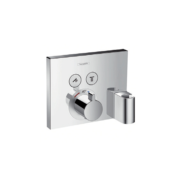Inbyggnadsblandare med tryckknapp för två funktioner och integrerad duschhållare. För montage i iBox.