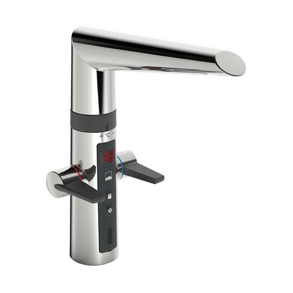 Disklådsblandare med användarvänliga vred för varm och kall-vatten samt beröringsfri funktion med temperaturvred. Elektronisk diskmask.avst. Svängbar pip. 230V. Ansl.slang med R10 lekande mutter.