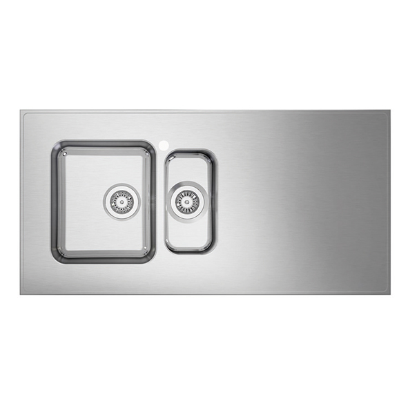 Diskbänk med slät yta, upphöjd kantprofil och förstärkt blandarhål. Djup = 600 mm, tjocklek = 30 mm, hodjup = 180 mm.