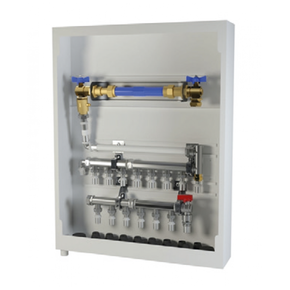 Läckagesäkert prefabricerat fördelarskåp för 8 st kall-vatten- & 6 st varmvatten-anslutningar samt med en förmonterad vattenmätarkonsol 190-220 mm.Lev. med kulventiler, skåpsgenomföringar & pressanslutningskopplingar.Mått (HxBxD): 710x550x120 mm.