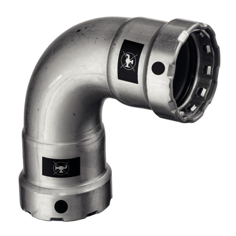 Pressböj i olegerat stål med zink-nickelbeläggning och EPDM-tätning. För värme-, kyl-, trycklufts- och sprinklersystem. Upp till 110 °C och 16 bar.