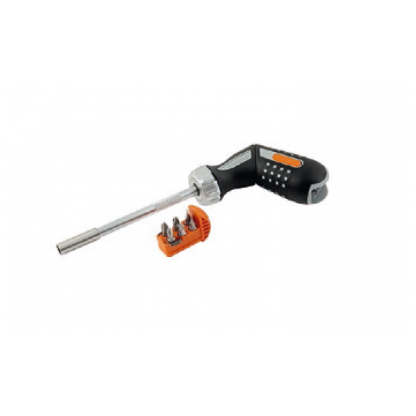 Vinkelbart handtag med plats för 6 st bits (ingår).