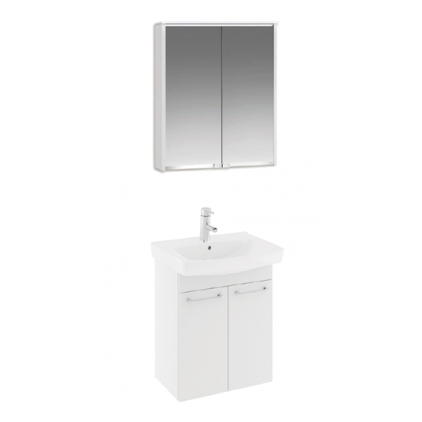 Tvättställsskåp, tvättställ och spegelskåp.