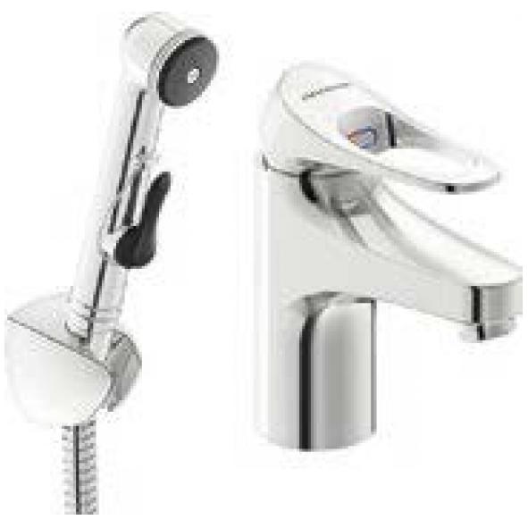 Mjukstängande tvättställsblandare med självstängande sidohanddusch. Kallstart. Ansl. slang med R10 lekande mutter. Blyfri, Energiklass A.