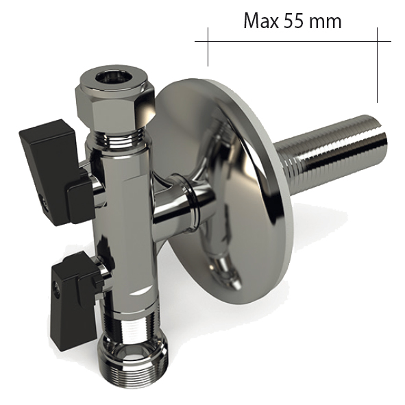 Med två (Cu 10 + R15/R20 utv.gg) avst. i vinkel. Utv. R15 för anslutning till LK väggdosa, med 80 mm väggbricka.