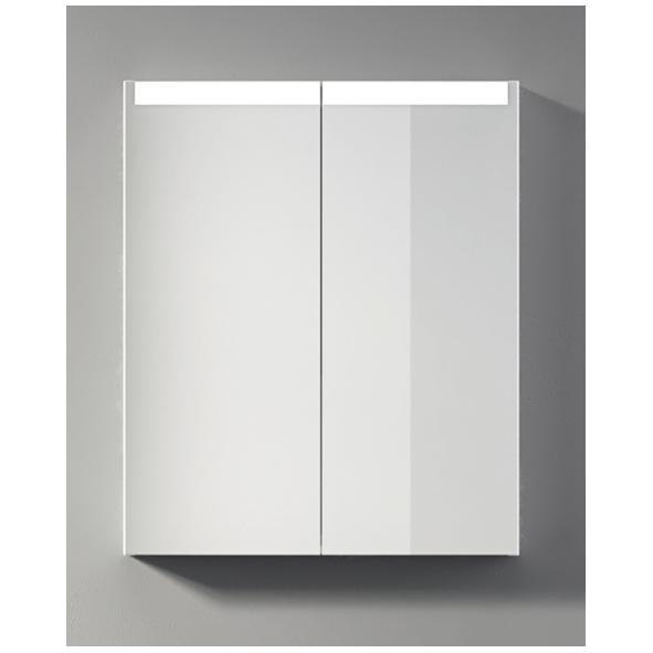 Spegelskåp med två spegelluckor, ovanbelysning och eluttag.