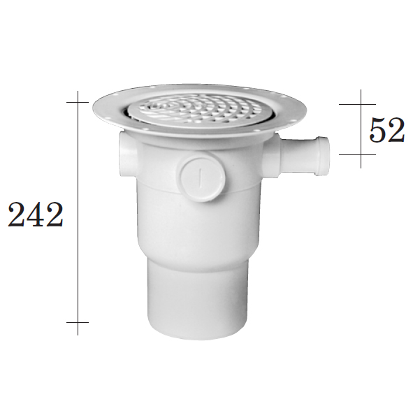 Golvbrunn med 1 st extra inlopp, dim 32. Flöde 1,4 l/s. Kan kompletteras med ytterligare 2 st extra inlopp dim 32. Köp till 7146104.