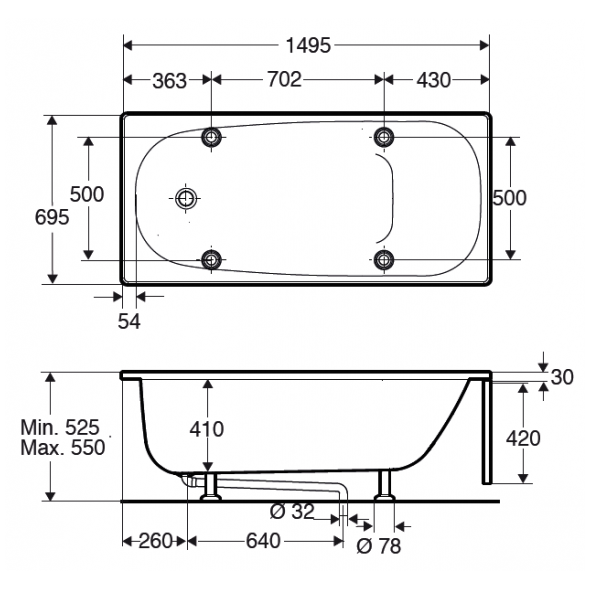 Badkar utan front. Mått (LxB): 1500x700 mm.