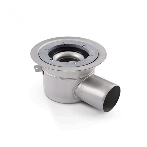 Rostfri sidoansluten golvbrunn. Med integrerad höjdjusterbar golvbrunnsfläns.