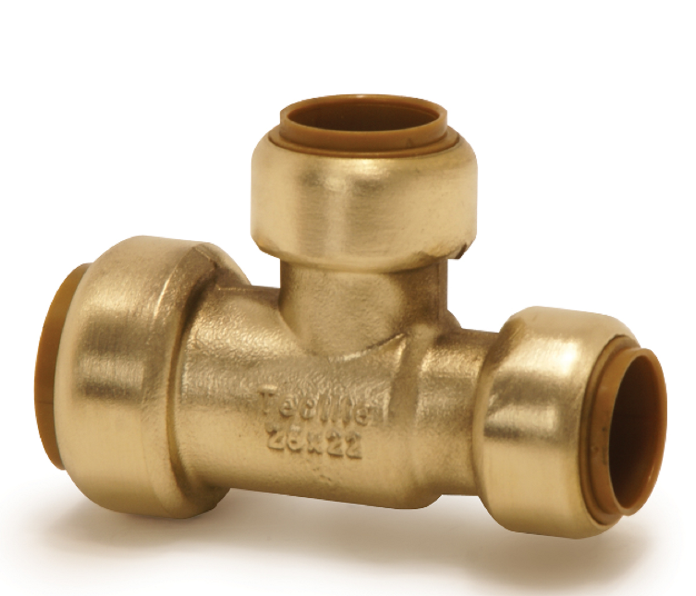 Tectite T27 T-koppling 22x15x15, förminskad pushkoppling x pushkoppling x pushkoppling gul i avzinkningshärdig mässing Classic body. Följande användningsområden: