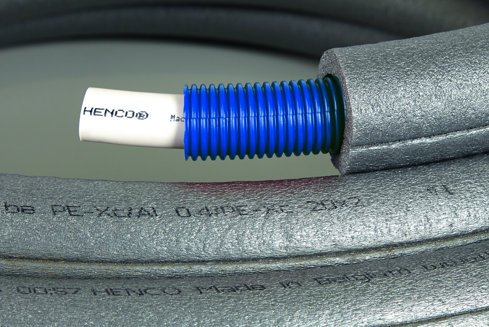 Henco pexrör Rör i Rör Standard med grå isolering 10mm 15x2,5x50m PEX-C i rulle med blått skyddsrör för värmesystem,tappvattensystem och kylsystem temperaturområde -20°C till +95°C grader.
