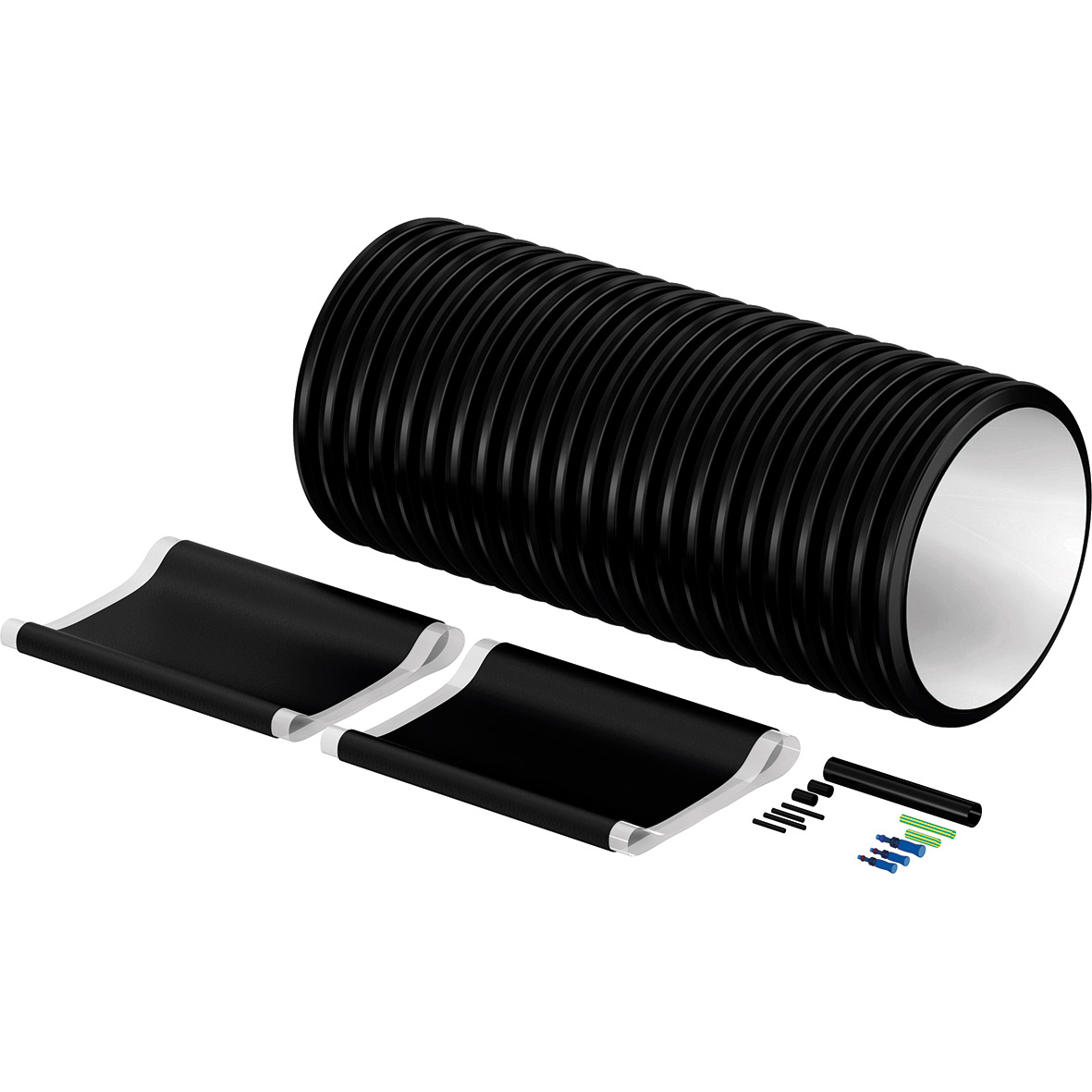 Setet innehåller en korrugerad skarvhylsa av PE för mantelrör, två krympmanschetter och delar för elektrisk skarvning av värmekabeln. Obs! Skarvsatsen ska alltid monteras med Uponor ändskydd. Till ändskydden medlevererade slangklämmor ska inte användas. Innehåller inga kopplingar för mediaröret.