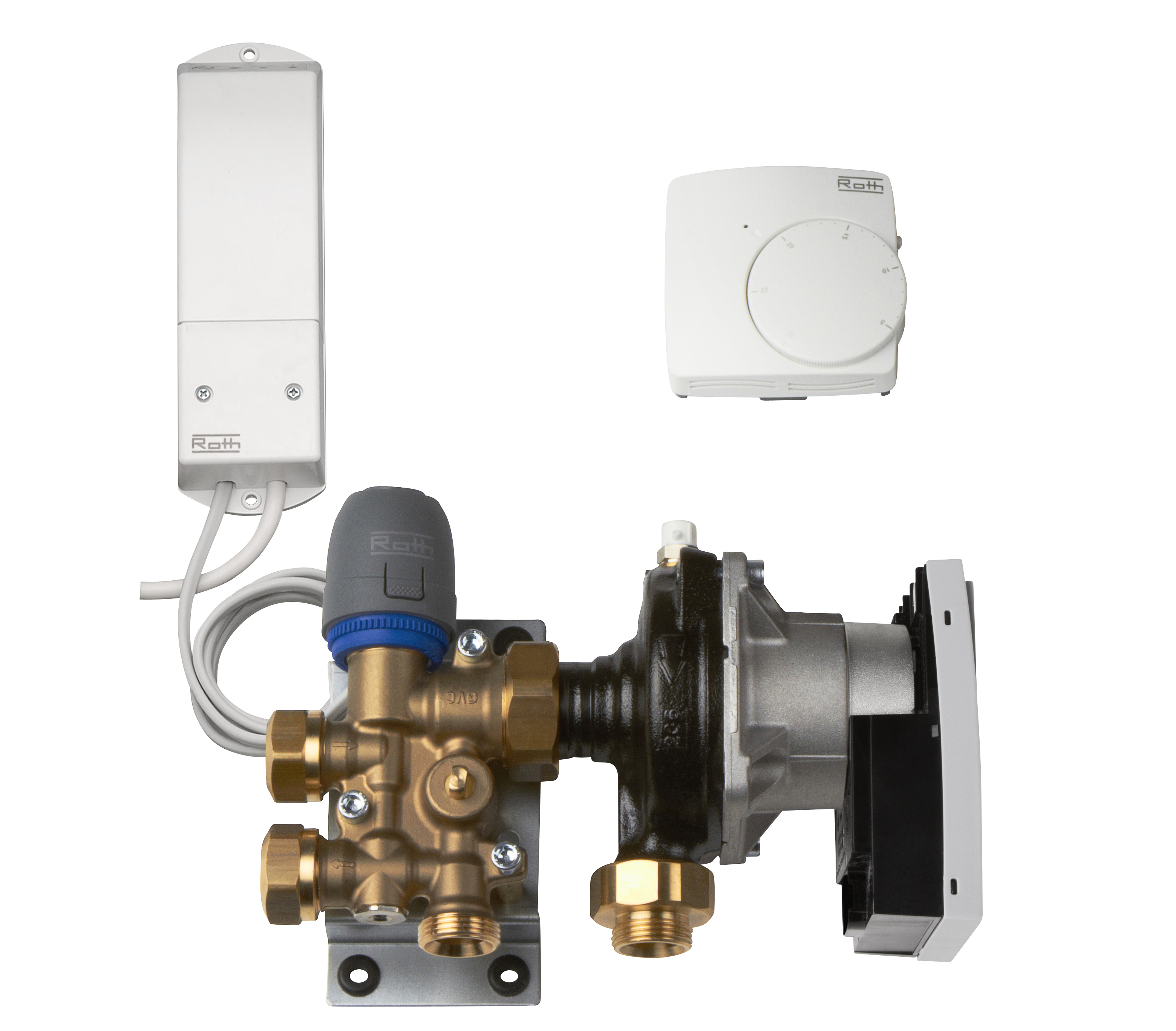 Roth minishunt GVC, trådlösMed elektronisk rumsreglering 5 - 30°C.Max. två lika långa slingor genom användning av duofördelare.Kapacitet: Upp till 50 m² vid 2 slingor.Max yta per slinga beror på val av rördimension och förläggningssätt.