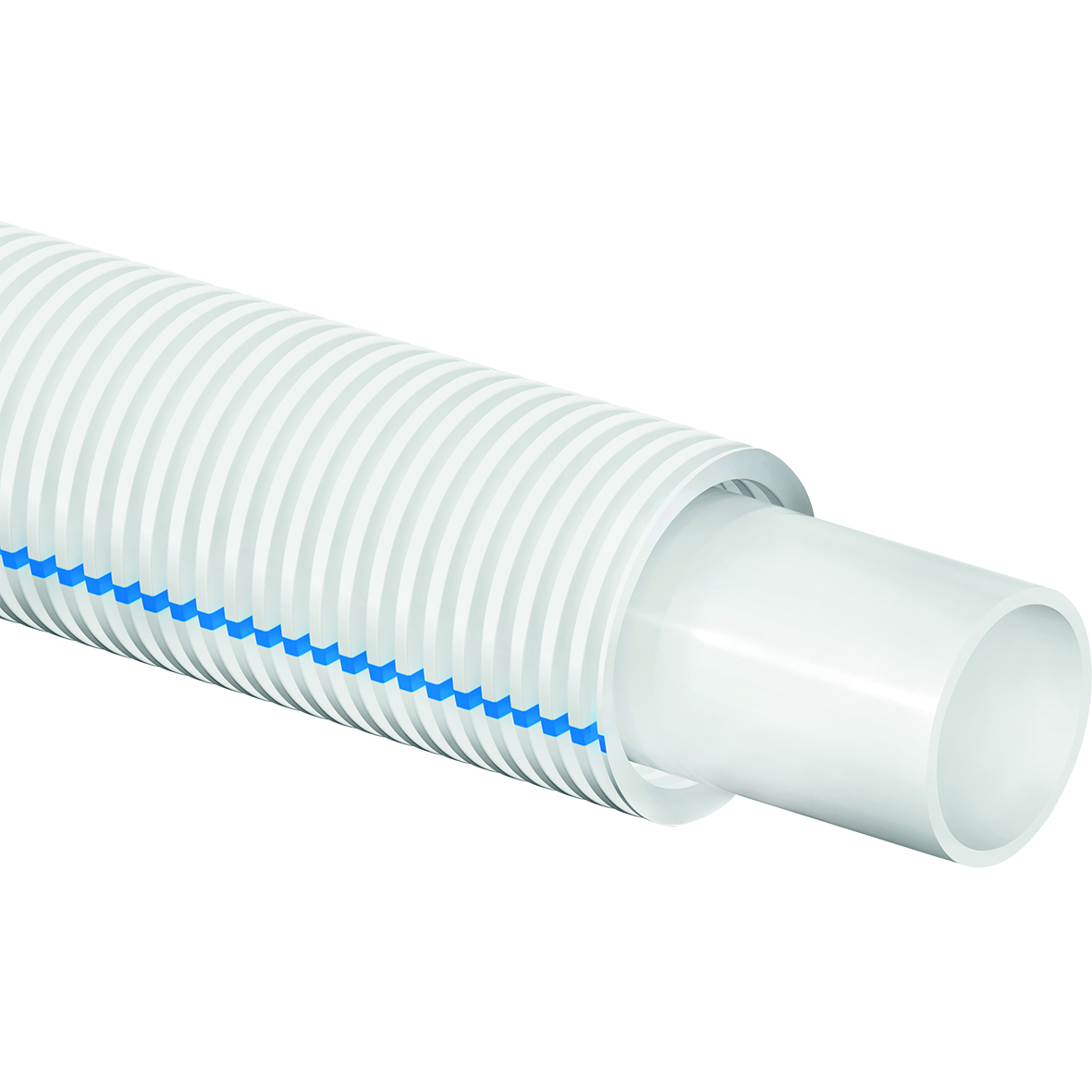 Levereras i ring. Uponor Aqua Pipe rör till tappvattensystem med vitt skyddsrör med en blå rand. Skyddsröret är tillverkat av polyeten (PE). PE-Xa rören är tillverkade enligt standarden EN ISO 15875 med dimensioner och toleranser enligt standarden. Tryckklass PN10, icke syrediffusionsspärrad.