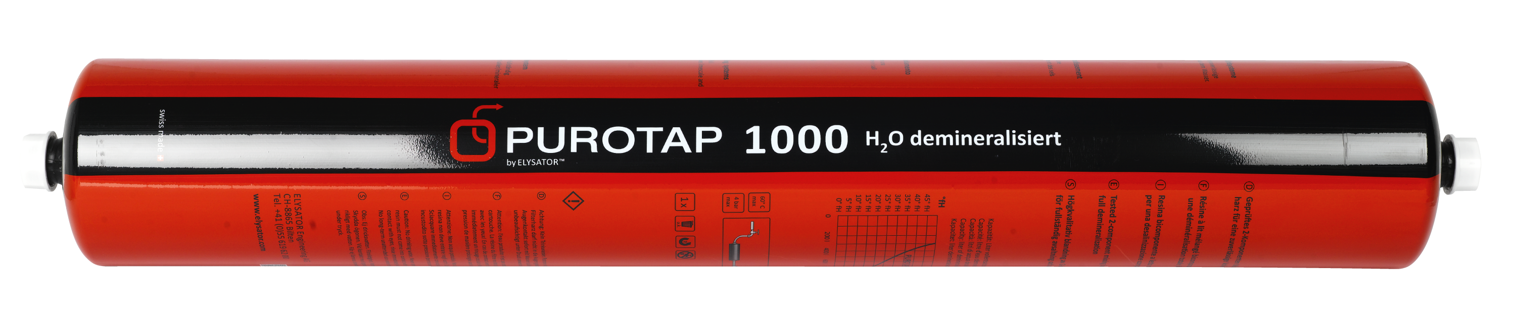 Purotap-patronen filtrerar bort kalk och aggressiva ämnen som sulfatet, nitarter och klorider från vattnet. Enheten arbetar med hjälp av en blandad bädd med jonbytare och levererar demineraliserat vatten med fullständigt avjoniserat kvalitet. Denna metod innebär att inga kemiska tillsatser tillförs till vattnet. Enheten fungerar utan extern strömförsörjning.