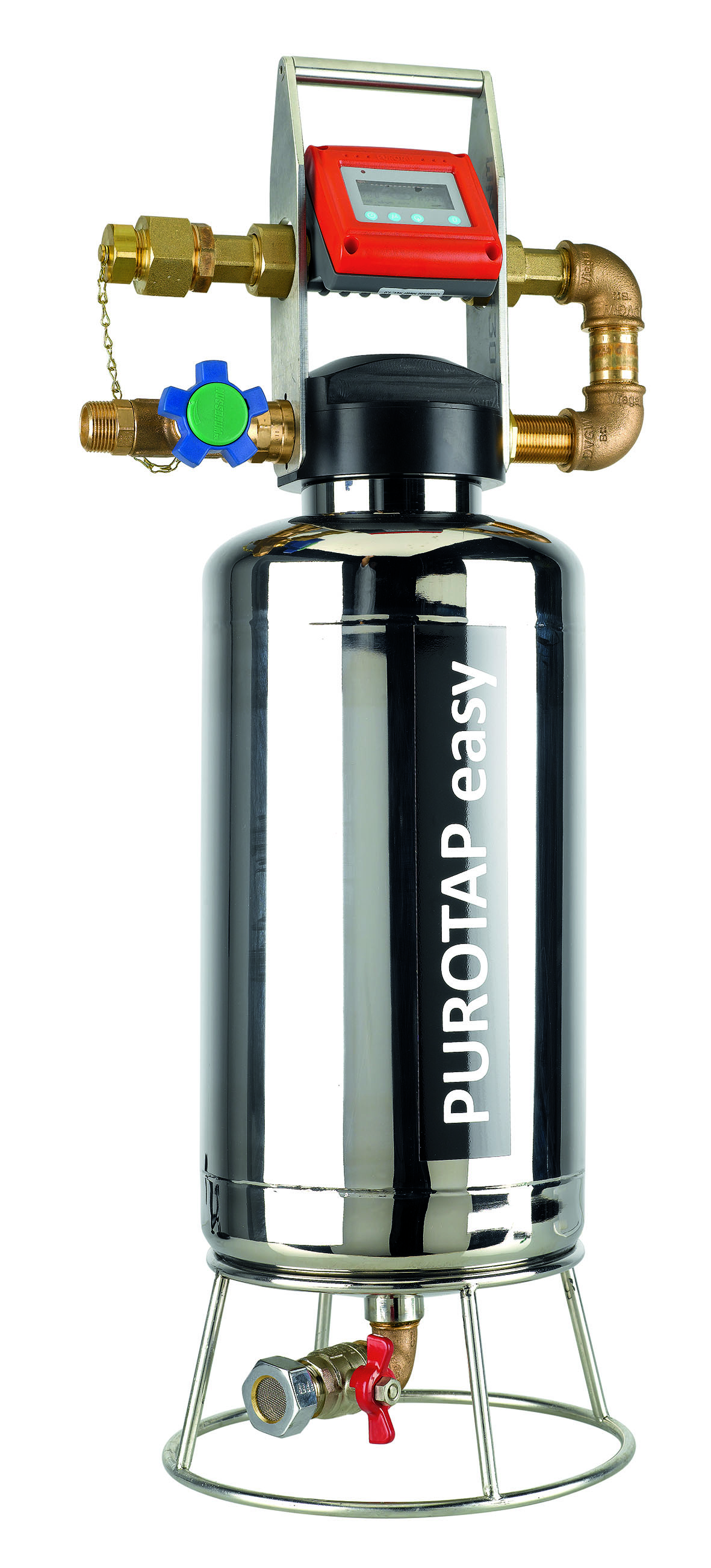 Mobil påfyllningsstation för mindre och mellanstora värmesysytem. PUROTAP easy II filtrerar kalk och aggressiva ämnen ur påfyllningsvattnet. Mätutrustningen möjliggör kontroll av påfyllningsvattnets kvalitet och visar när hartset har förbrukats. Harts kan utan problem fyllas på direkt på plats.