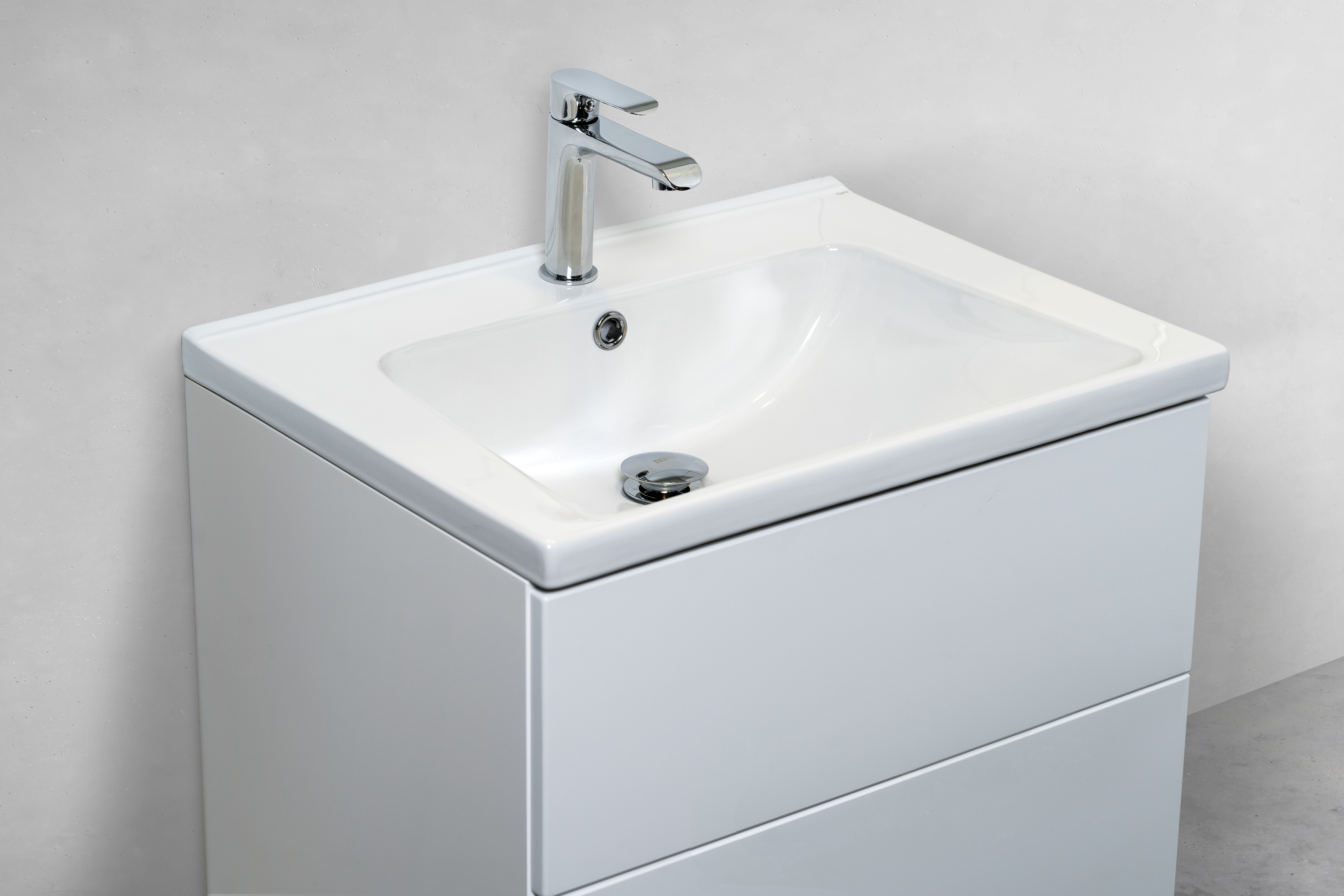 Modernt format porslinstvättställ med ho som sträcker sig ändra fram till kanten och samtidigt erbjuder avställningsytor på sidorna och i bakkant. 35mm tjockt. Överfyllnadsskydd CL15. (Kan även monteras på konsol(?)) Ej snyggt att montera på konsol, undersidan syns och är ej målad.