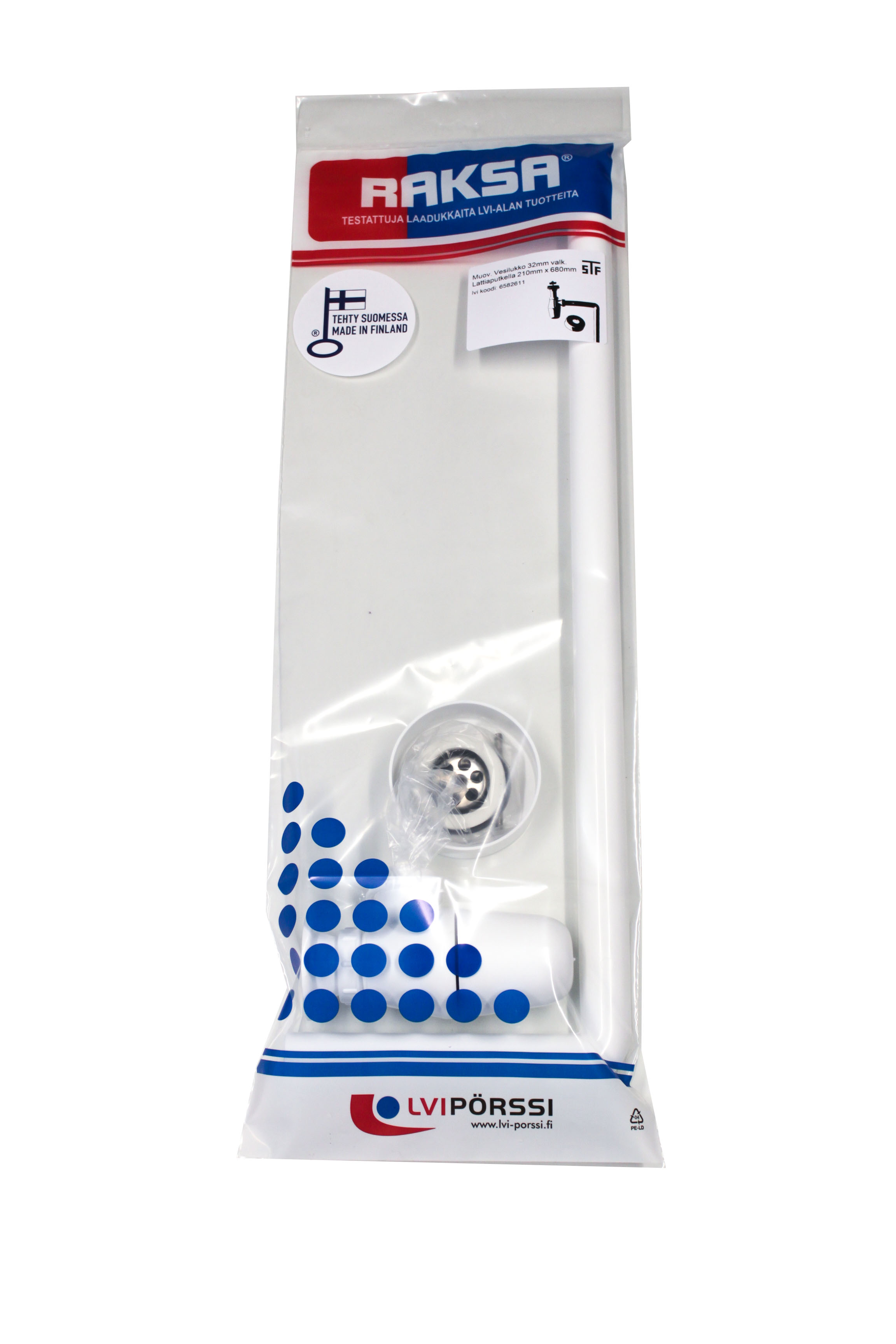 LVI-Pörssis egentillverkad RAKSA vattenlås med golvrör, ett vattenlås som är säkert och enkelt att installera. 32mm Vattenlås är färdigt monterad i en zipper-påse med alla tillbehör.