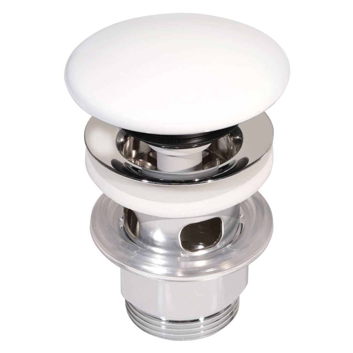 Bottenventil med push down funktion, vilket innebär att man trycker ner ventilen för stängning och trycker ner en gång till för öppning. Propp i vit porslin.