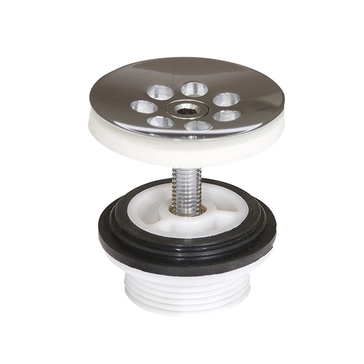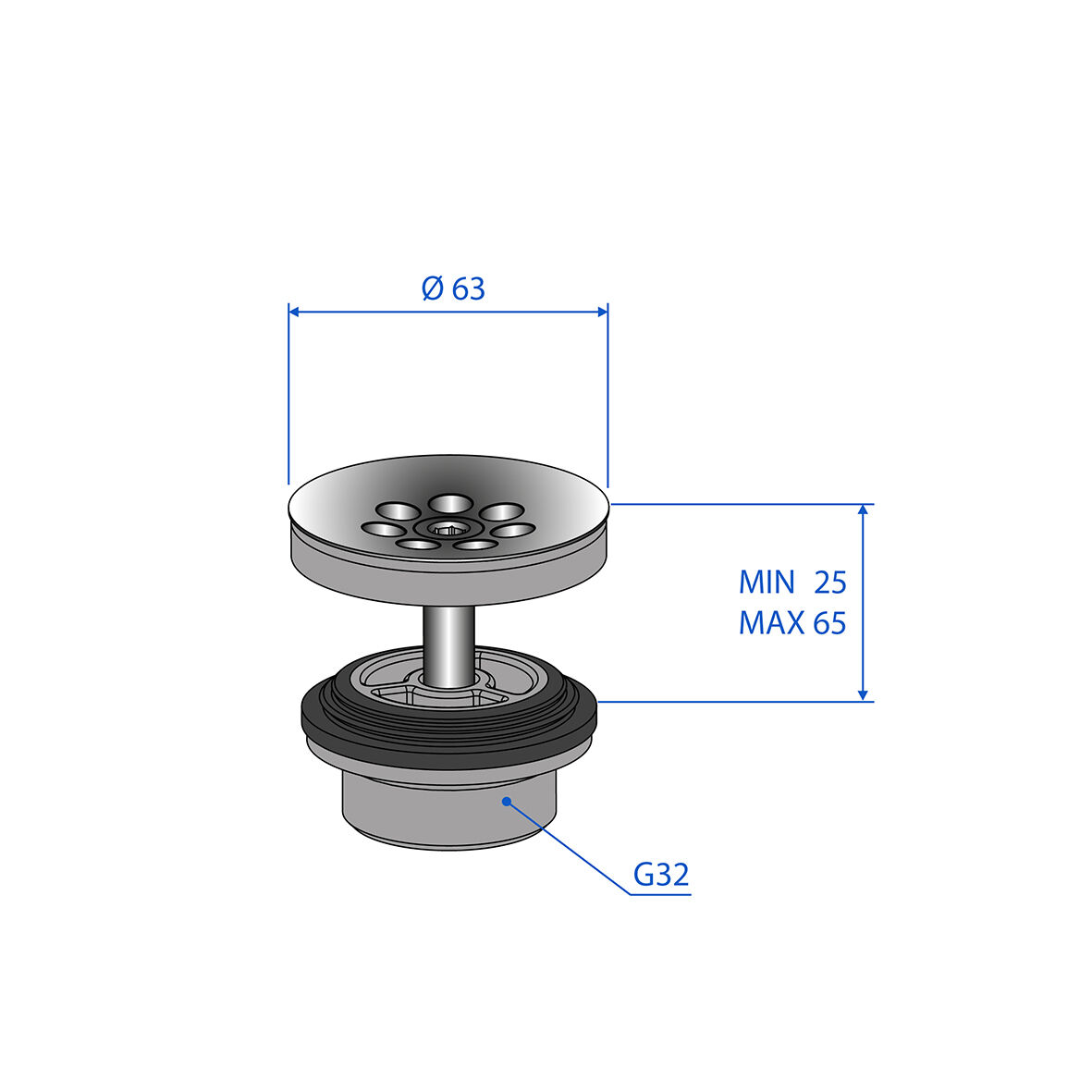 Bottenventil utan propp G 32 med bräddavlopp för tvättställ. Polerad förkromad med slät silöverdel. Underdel i vit plast. Byggmått 25-65mm. Multipack