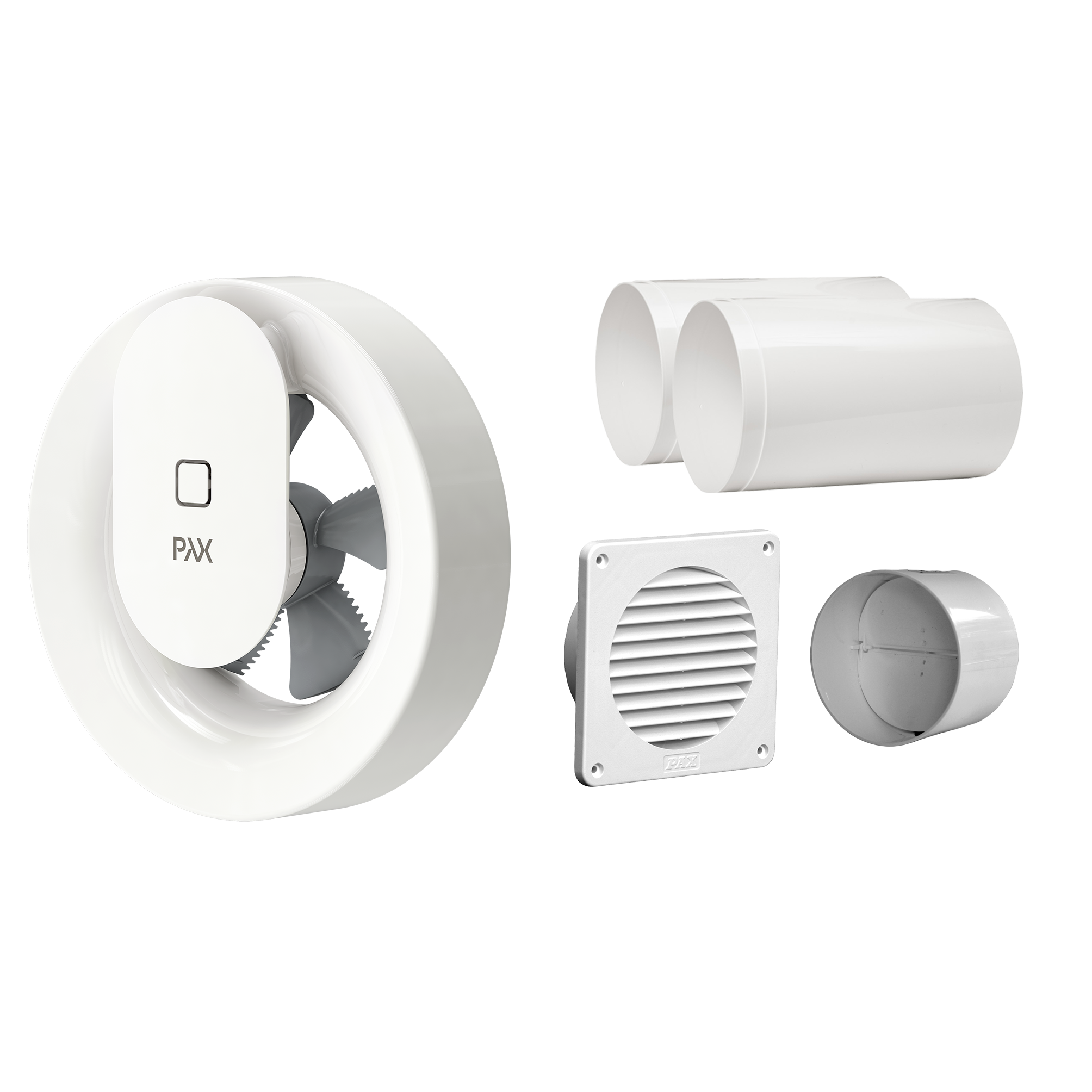 Komplett frånluftspaket: 1 st Calima fläkt (1550-1, RSK 8760348), 2 st väggrör (8157-1, RSK 8757978), 1 st ytterväggsgaller vitt (8156-1, RSK 8758086) och 1 st kallrasspjäll (8127-1, RSK 8760523).