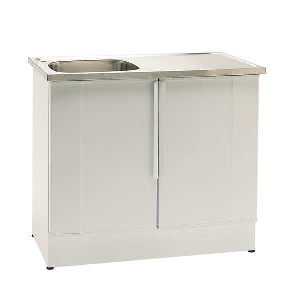 Stor heltäckt bänk med rejäl tvättlåda, stor avställningsyta, tre stora trådbackar och dubbla förvaringsfack i dörrarna.